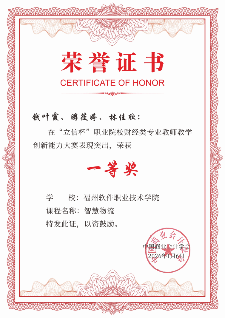 2026年“立信杯”职业院校财经类专业教师教学创新能力大赛圆满落幕。福州软件职业技术学院钱叶霞、游筱婷、林佳欣三位教师凭借《智慧物流》课程的精彩呈现与扎实的教学创新能力,在赛事中表现突出,成功斩获全国一等奖。