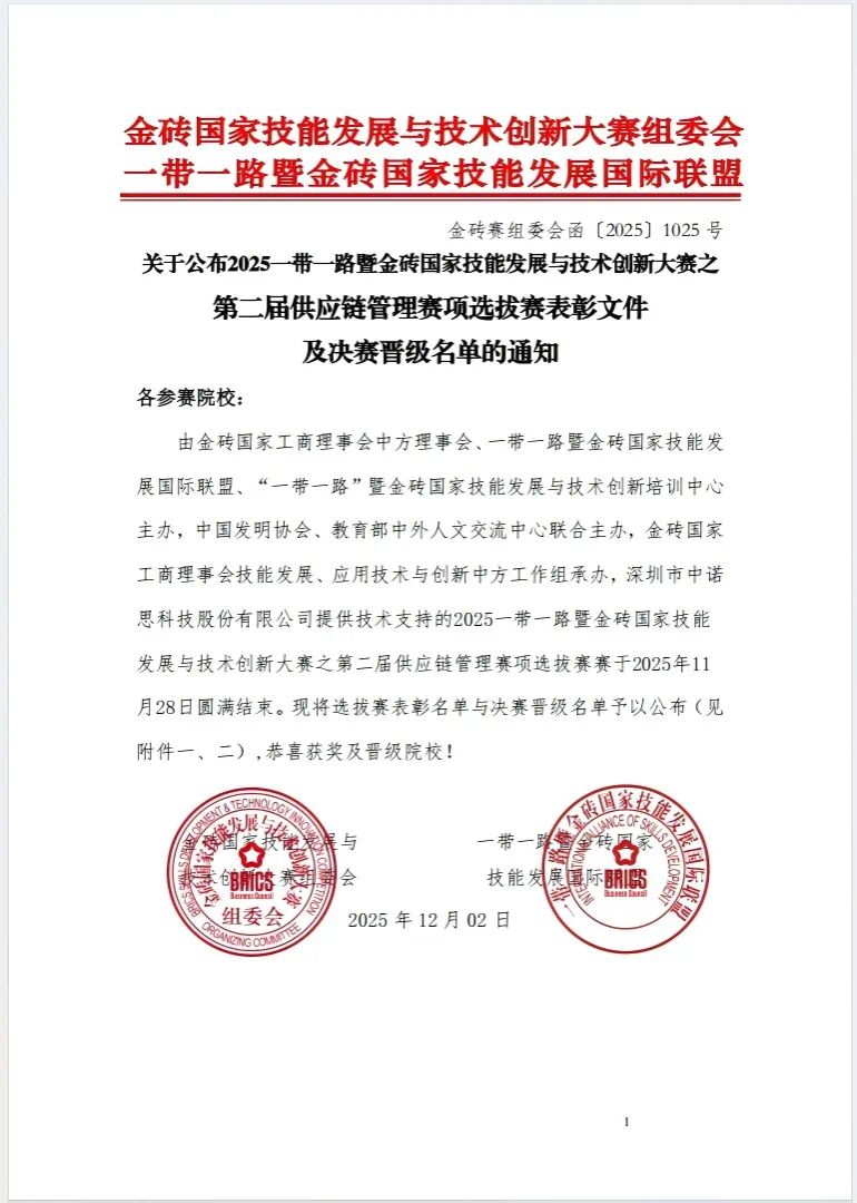 2025年12月2日,2025年一带一路暨金砖国家技能发展与技术创新大赛“供应链管理”赛项全国选拔赛圆满落幕。数字金融产业学院学子凭借扎实的专业功底、出色的团队协作与高效的实践操作,从众多参赛队伍中脱颖而出,荣获高职组二等奖,充分展现了我校在物流管理领域的人才培养成效与教学实力。