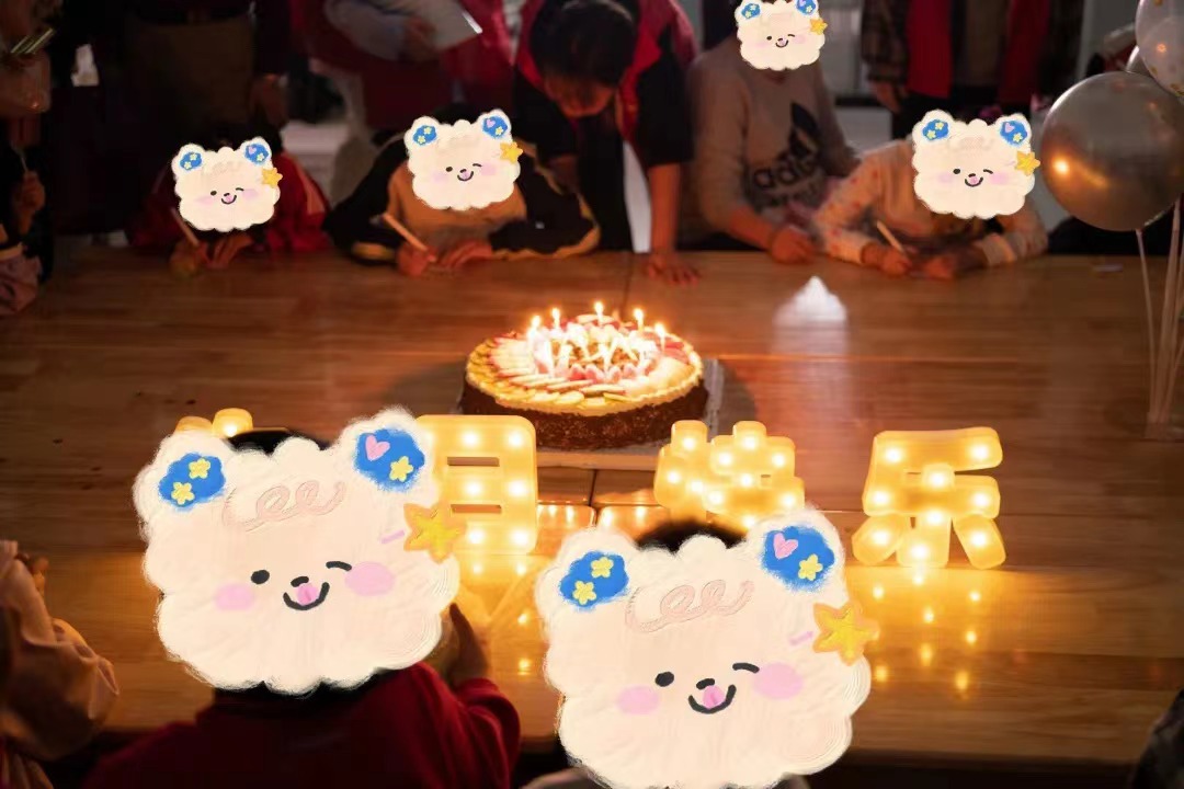 在大家的欢呼雀跃声中,志愿者为小朋友们戴上喜庆的“寿星帽”,点燃生日蜡烛,伴着欢快的音乐,大声齐唱生日歌,小朋友们围坐在蛋糕旁,双手合拢竖立胸前,双眼微闭许下心愿。和志愿者们分享生日蛋糕,分享他们生日的喜悦,志愿者送上最诚挚的祝福,每一句祝福都传递出浓浓的情谊。