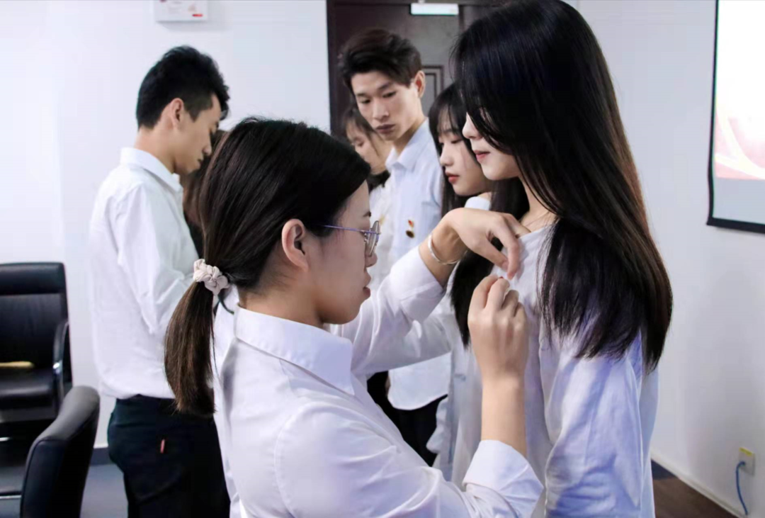 在宣誓结束后,由教师党员同志对新接收预备党员同志进行授徽仪式。
