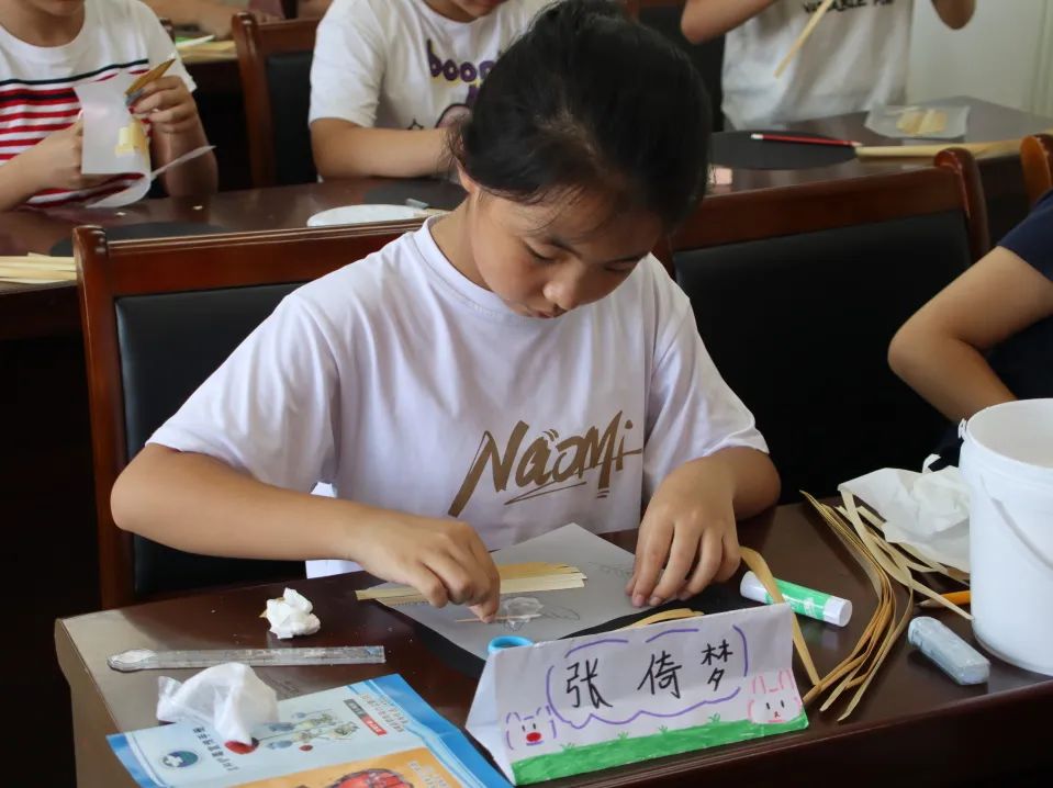 在实践队员的指导下,麦秆在小朋友们的手里“活”了起来,层叠的麦秆纹勾勒出抗战历史的痕迹。