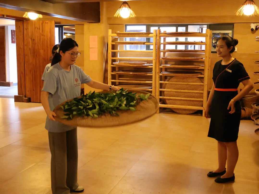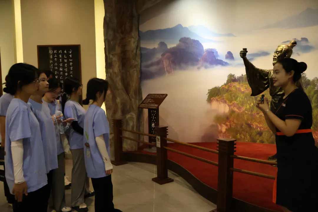 在武夷香江茗苑茶企,实践队员们在当地讲解员的带领下探访曦瓜茶叶品牌。讲解员细致为实践队员们介绍武夷山茶叶的发展脉络、传统与现代结合的制茶流程,并讲述“茶寿”的文化寓意、“半壁江山大红袍”的故事,让实践队员们对当地深厚的茶文化有了直观认识。