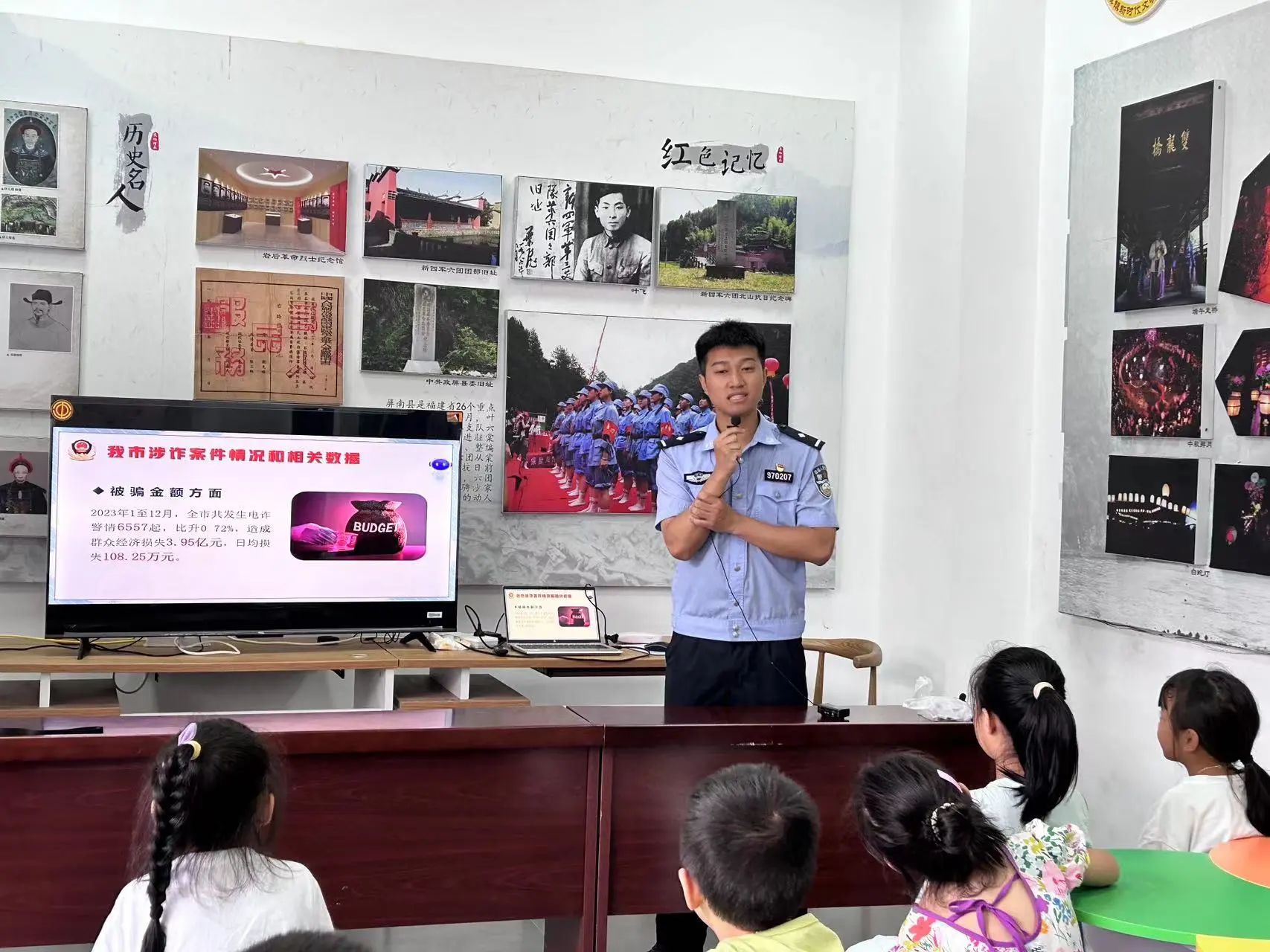活动伊始,民警和实践队员分别通过课件等数字资源,以通俗易懂的语言,结合生动的案例,绘声绘色向小朋友们介绍了网络诈骗的常见手段如:虚假中奖信息、冒充亲友求助、网络购物、游戏充值诈骗等。让小朋友们深刻认识到网络诈骗的危害性和普遍性。