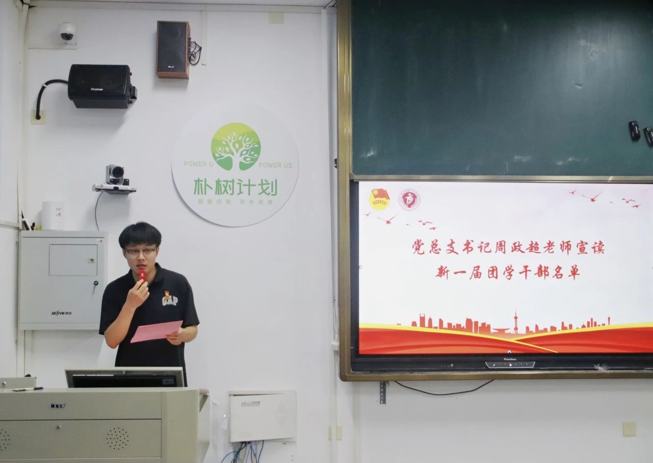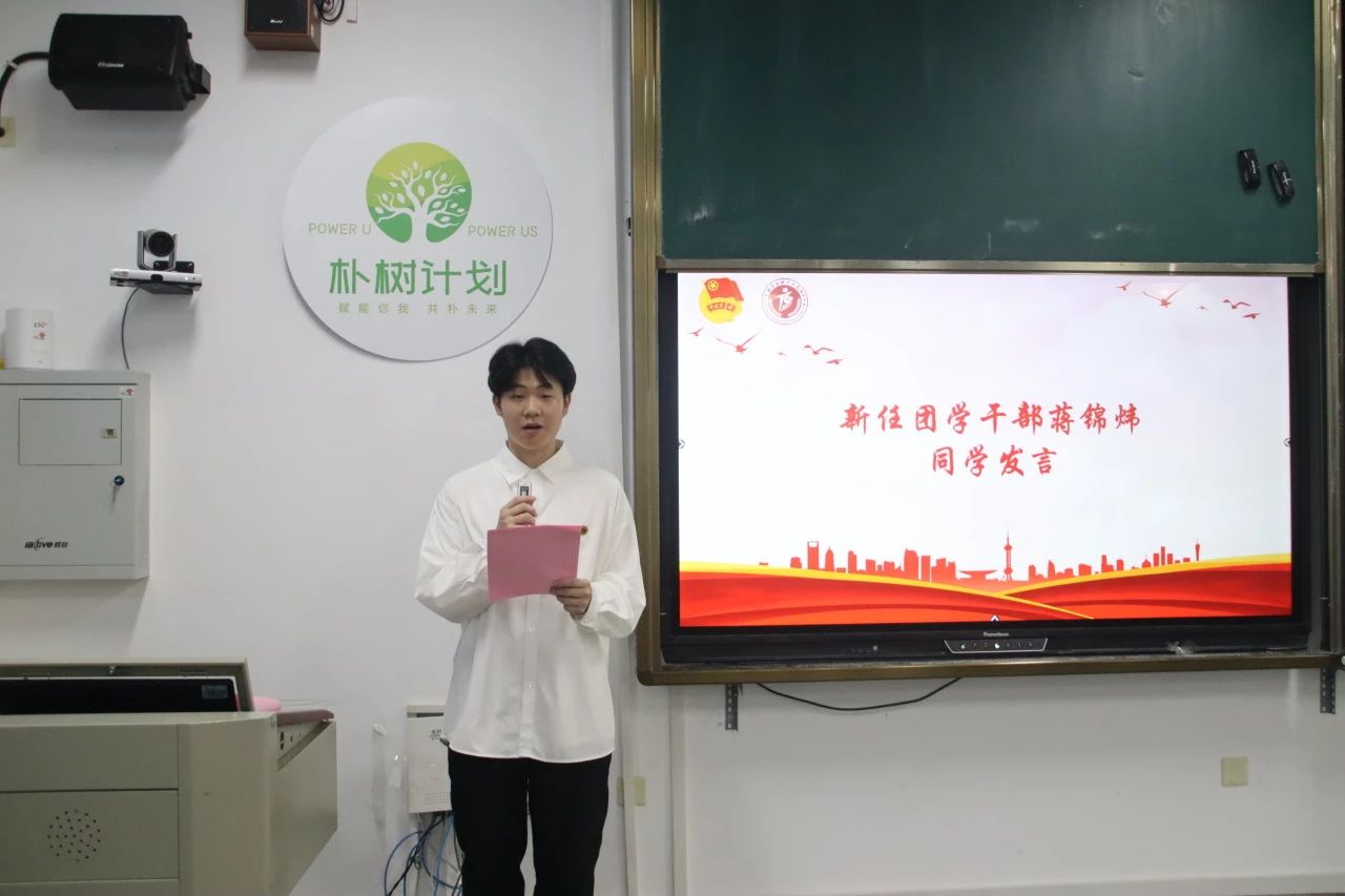 党总支书记周政超老师宣读第七届团学干部名单。新一届团学干部代表蒋锦炜同学发言,他首先展现出自己对于未来工作的热情与信心,接着对于未来工作的开展提出了三点设想:第一,要正确自身定位,提高服务意识,做好桥梁纽带的作用;第二,要在明确自身职责的同时虚心接受建议,创新工作模式;第三,要起到模范带头作用,注重自身素质培养与团队组织建设。他分享到团学干部要脚踏实地、求真务实地开展工作,以自身的力量带动整体队伍的提高与发展。