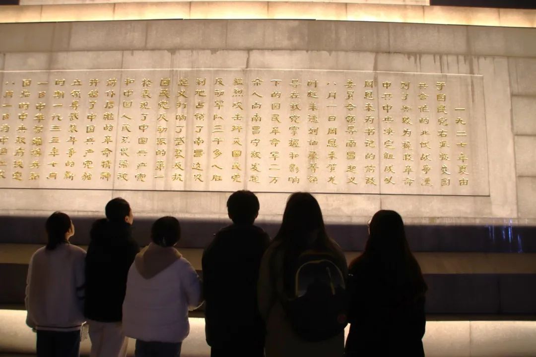 实践队员到达军旗升起的地方,在八一南昌起义纪念塔下,望着正面英雄们用血汗书写的鎏金历史,抚过侧面一幕一幕无数英雄浮雕构就的战斗场景,每个人心中都肃然起敬,爱国主义的伟大旗帜在心中高高飘扬。