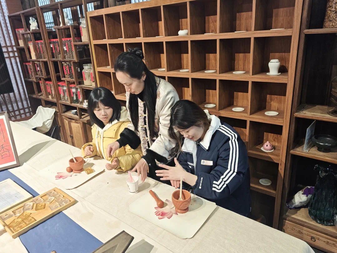 在制作过程中,实践队队员敛息静气沉浸其中,以木杵匀稳捣压香粉至细腻,加天然黏合剂调和后反复揉捻成柔韧香泥,再分搓成丸状嵌入雕花木模轻压成型。非遗老师俯身观照、适时指导,微调按压的力度,提点香泥湿度的分寸。脱模后的香珠雏形经自然阴干,凝萃着草木灵韵与手作温度,将千年非遗的雅致底蕴凝于这方寸珠粒之间。