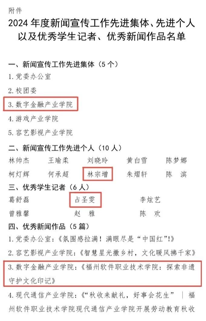 1月13日,中共福州软件职业技术学院委员会公布了关于表彰2024年度新闻宣传工作先进集体、先进个人以及优秀学生记者、优秀新闻作品的决定,我院荣获4项殊荣。数字金融产业学院荣获2024年度新闻宣传工作“先进集体”称号;
