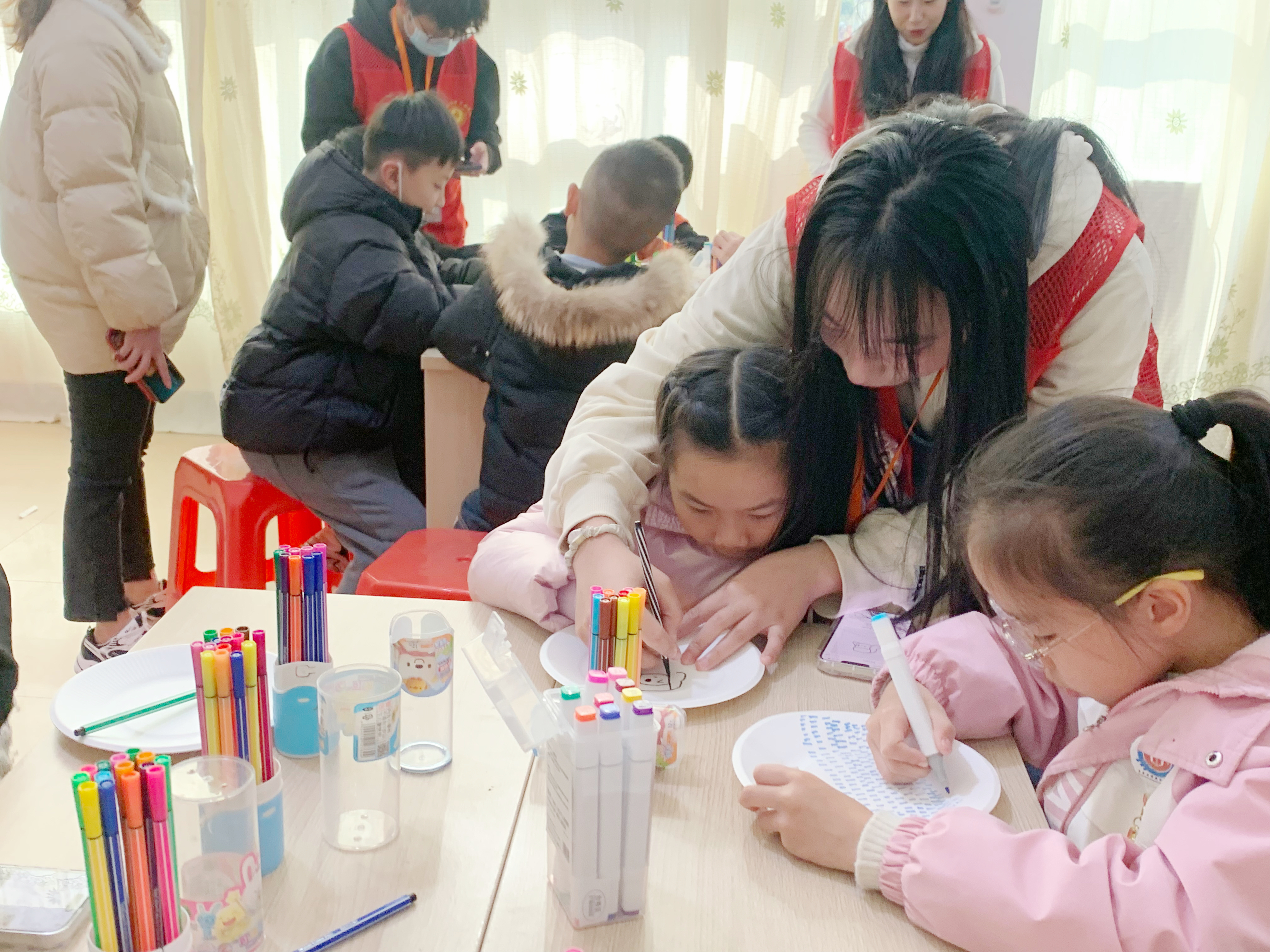 志愿者为小朋友介绍色彩搭配的要领,引导他们用水彩笔在餐盘上充分发挥自己的想象力进行创作,经过大家的共同努力,制作出一幅幅绘声绘色,惟妙惟肖的作品,感受色彩带来的艺术魅力。