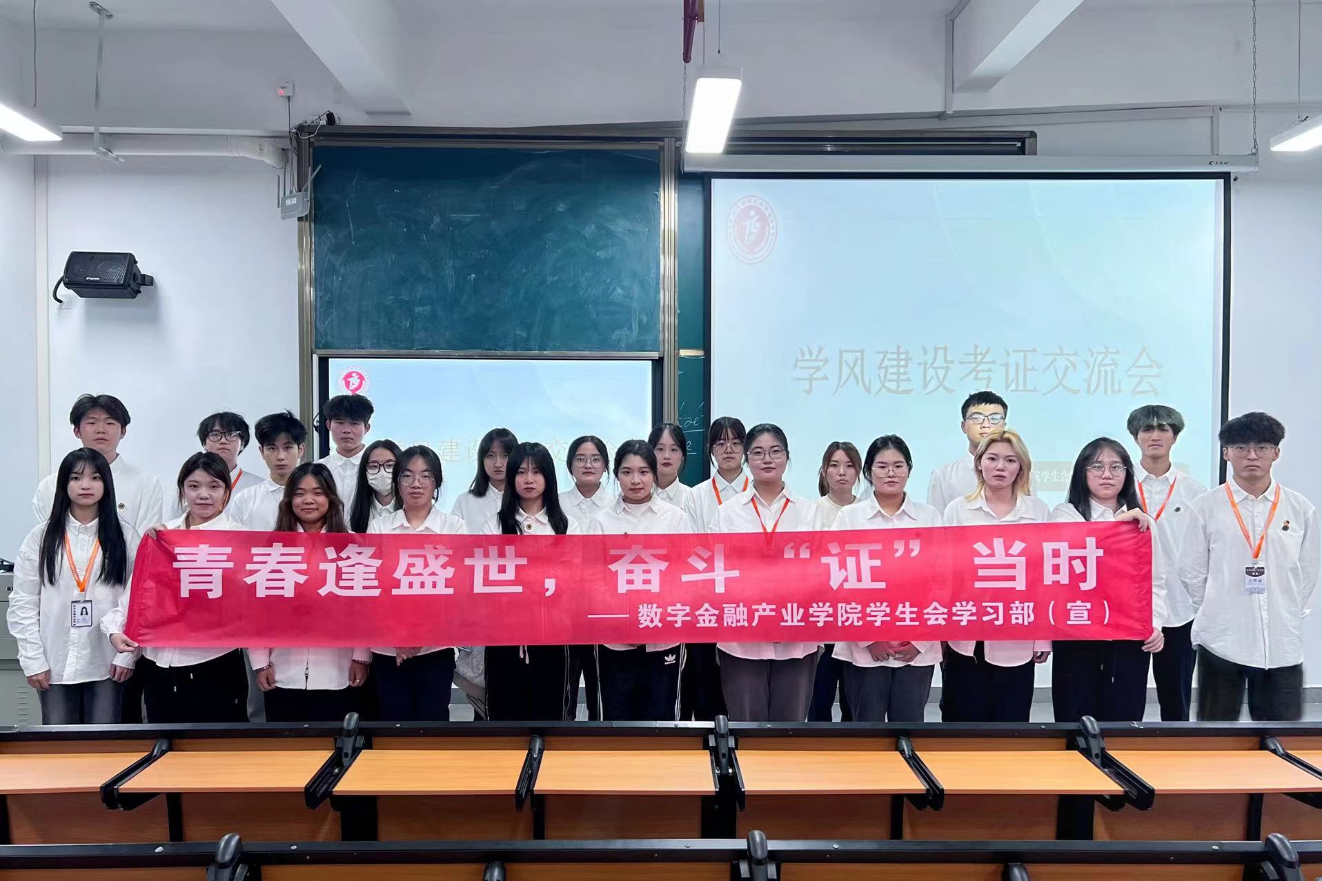 为加强学风建设,丰富知识储备和专业素养,激发学生的积极性,增加个人的竞争优势,数字金融产业学院学生会学习部于12月3日19:30在教学楼开展以“青春逢盛世,奋斗“证”当时”为主题的考证交流会,本次活动参会人员有学习部全体成员以及2023级全体学生。