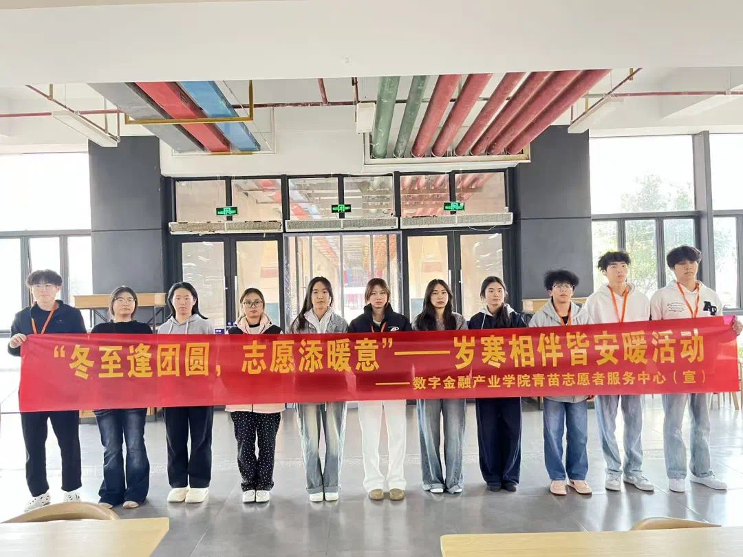 为传承中华民族传统节日文化精髓,增强全体师生的文化自信与集体归属感,营造和谐友爱的校园氛围。2025年12月19日数字金融产业学院青苗志愿者服务中心举办“冬至逢团圆,志愿添暖意”岁寒相伴皆安暖活动,为全体师生送上冬日温暖。