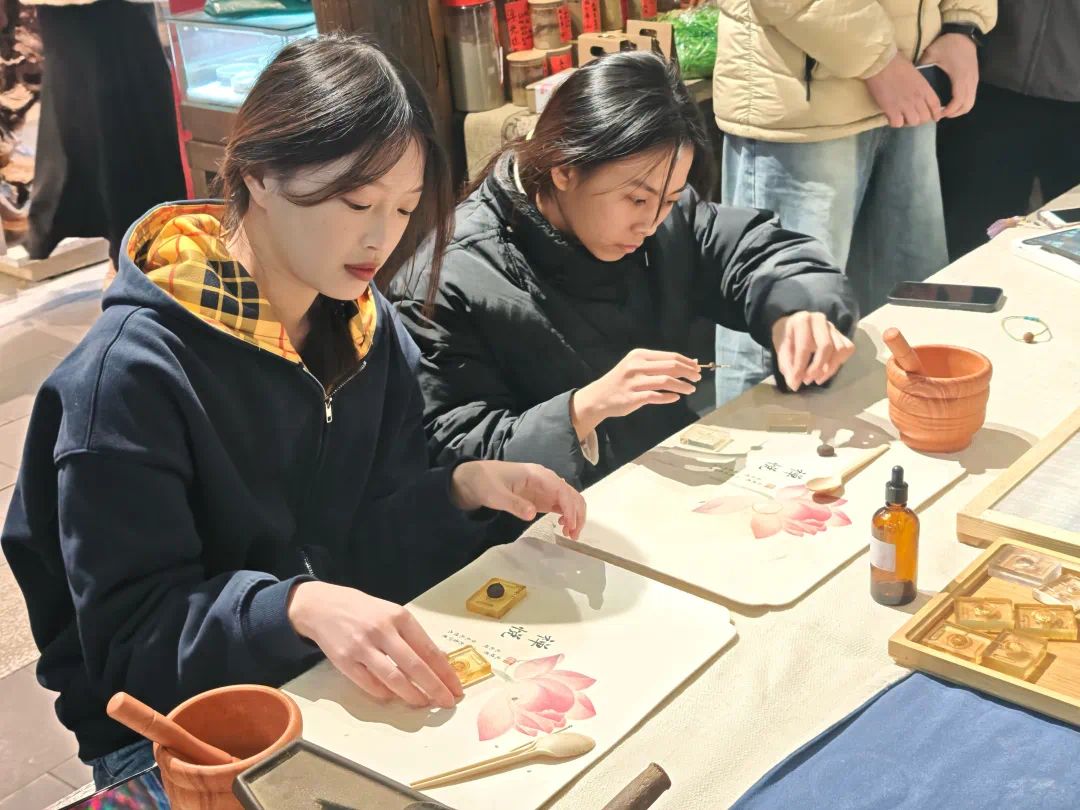 在制作过程中,实践队队员敛息静气沉浸其中,以木杵匀稳捣压香粉至细腻,加天然黏合剂调和后反复揉捻成柔韧香泥,再分搓成丸状嵌入雕花木模轻压成型。非遗老师俯身观照、适时指导,微调按压的力度,提点香泥湿度的分寸。脱模后的香珠雏形经自然阴干,凝萃着草木灵韵与手作温度,将千年非遗的雅致底蕴凝于这方寸珠粒之间。