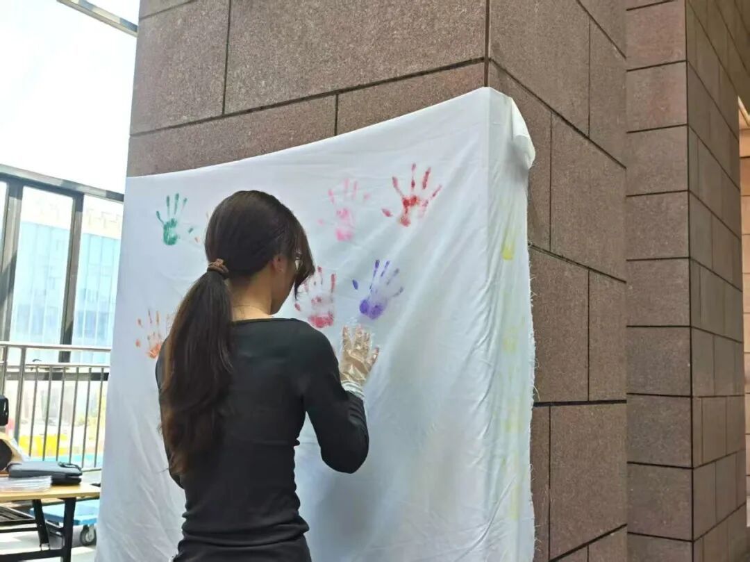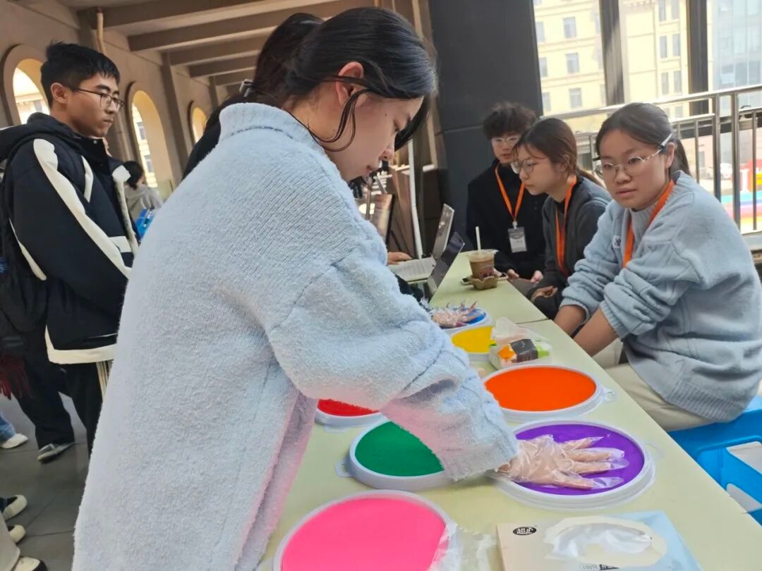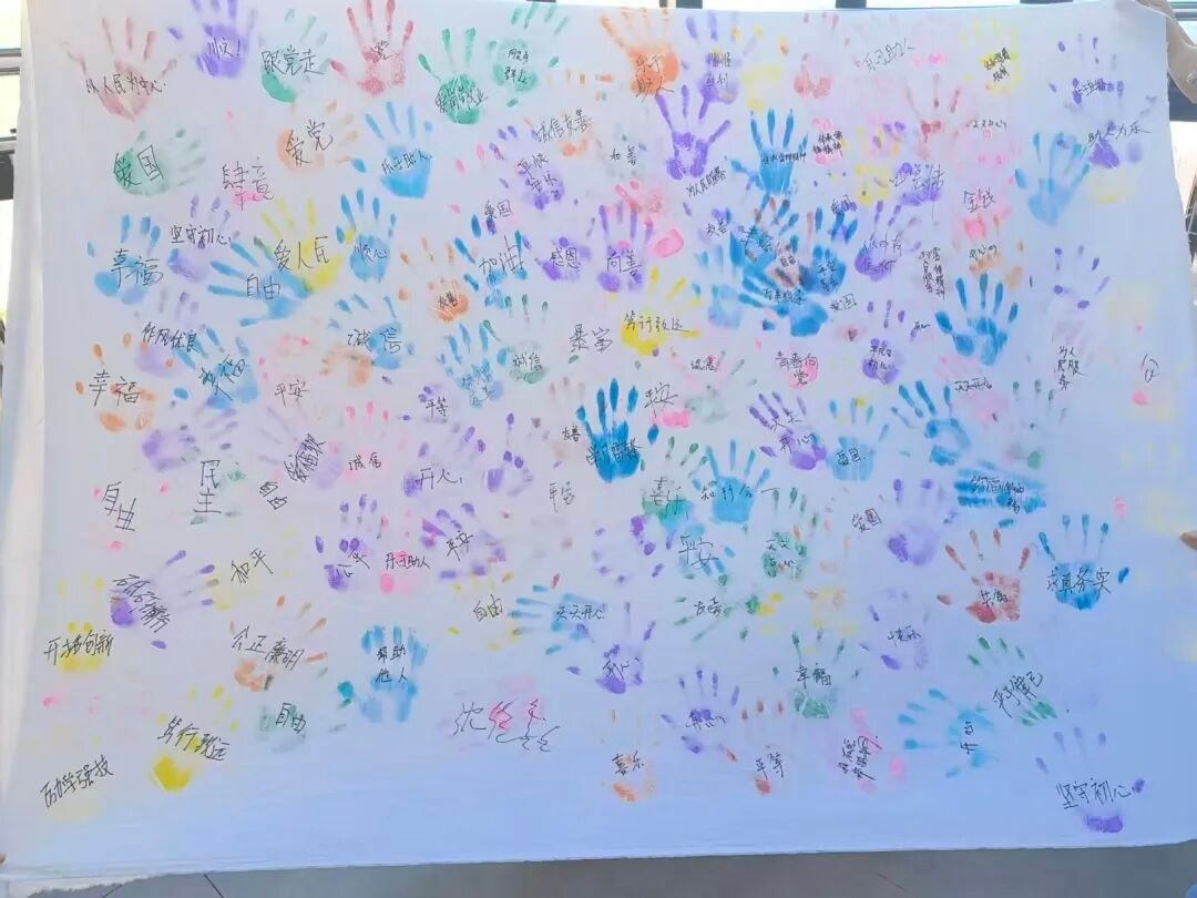 活动现场,同学们以掌为笔、以彩为墨,蘸色印掌于纯白画布。缤纷掌印错落交织,每一枚都承载着对雷锋精神的敬意,每一抹色彩都凝聚着践行的决心。