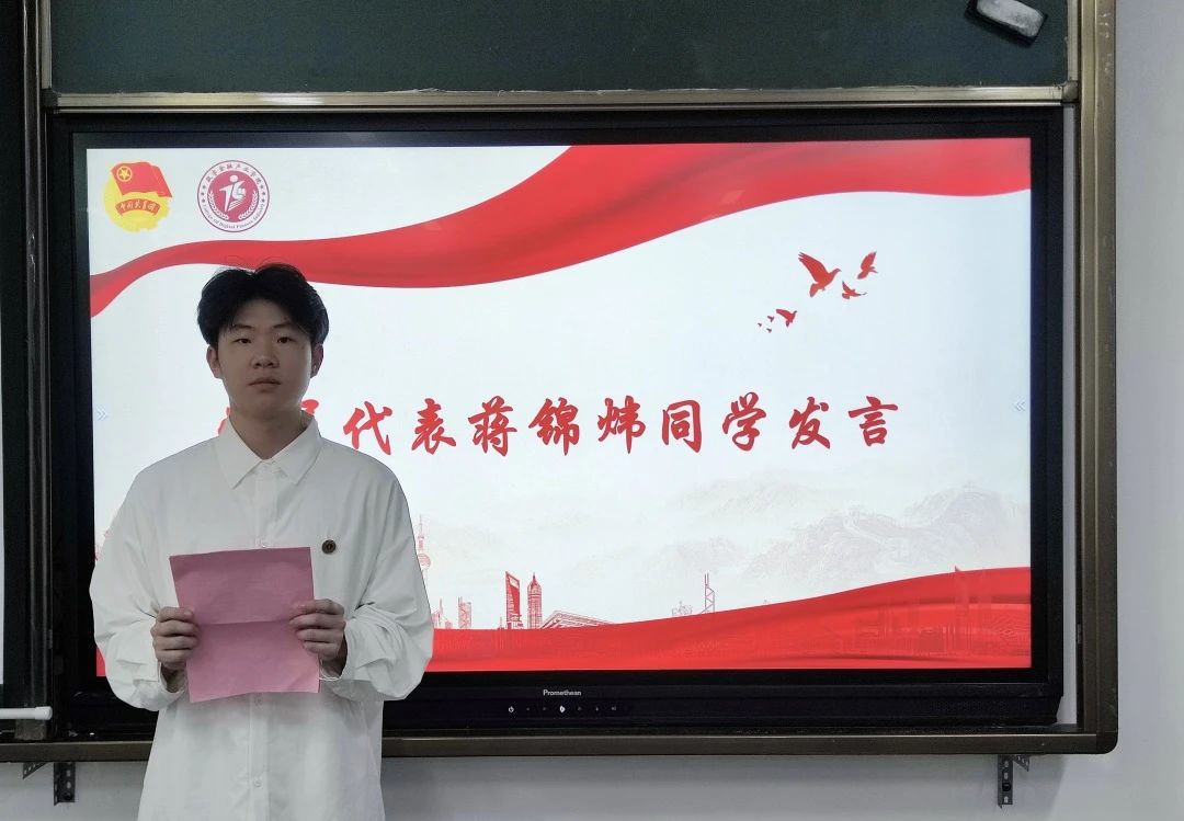入团积极分子学员代表蒋锦炜发言,他表示将以青春之热血,青春之干劲,积极参加团组织的各项活动,与时代同心同向同行,踔厉奋发,笃行不怠,发挥模范带头作用,用热情带动身边的同学勤奋学习、锐意进取。