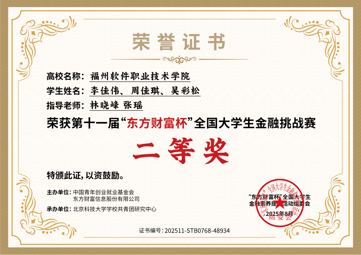 2025年8月22日,第十一届"东方财富杯"全国大学生金融挑战赛圆满落幕。福州软件职业技术学院数字金融产业学院林晓峰与张瑶老师共同指导的参赛团队(成员:李佳伟、周佳琪、吴彩松)凭借出色的金融投资分析能力和团队协作精神,在全国总决赛中荣获二等奖,为学校争得荣誉。