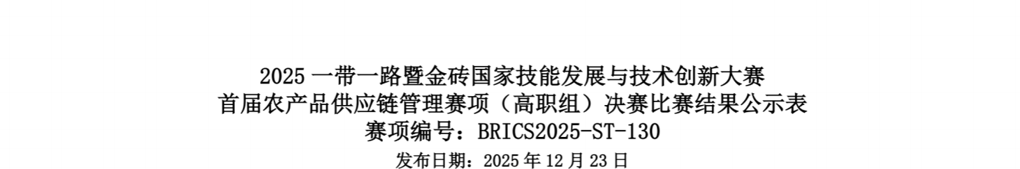 12月23日,在2025一带一路暨金砖国家技能发展与技术创新大赛“首届农产品供应链管理赛项”国际总决赛中,我校数字金融产业学院现代物流管理专业选派的学生团队,在全国349支参赛队伍中脱颖而出,凭借扎实的专业功底与出色的实战能力,成功斩获全国总决赛三等奖,充分展现了我校在物流管理领域的人才培养成效与教学实力。