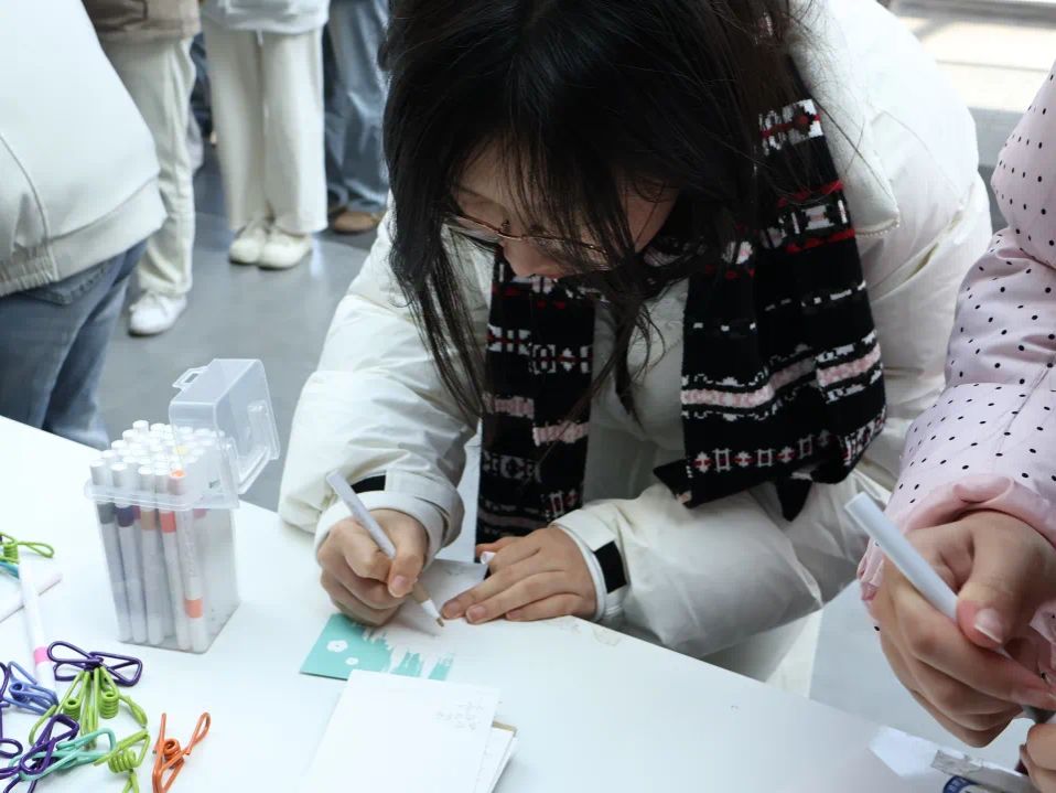 五彩斑斓的明信片层层叠叠,一张张承载心意的卡片被整齐排列在展览板上,成为校园里一道温暖的风景线。