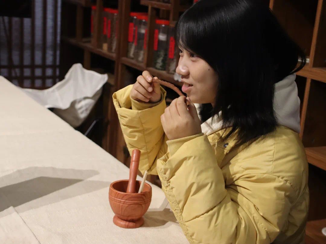 活动伊始,非遗老师手持一罐香材俯身开讲,指尖轻摇间暗香悠然浮动。她以“溯其源、识其香、知其制”为脉络,带领实践队队员走进香珠的非遗世界,细讲古方传承、药香文化,以及沉香、檀香、艾草等香材的特质与辨识方法。队员们围坐倾听,不时拈香细嗅,目光追随着桌上琳琅的香罐与捣具,对这缕跨越时光的非遗香艺悄然生出浓厚的探究之心。