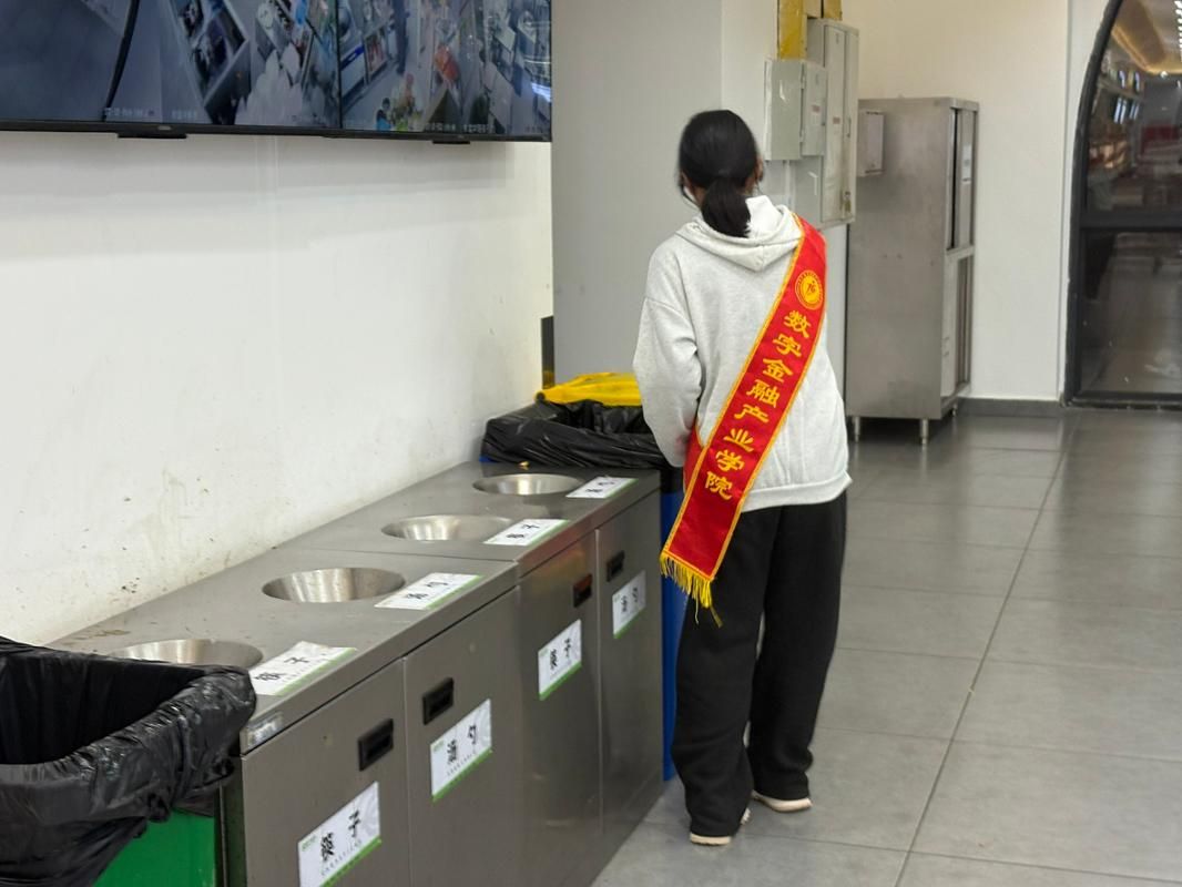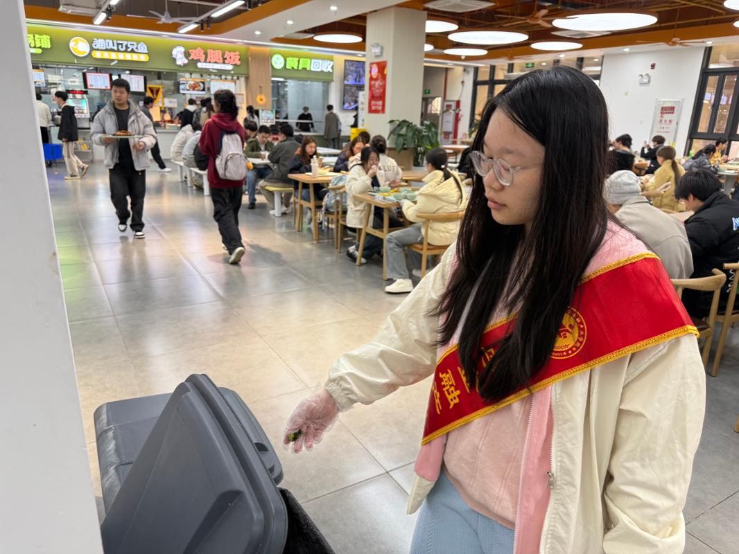 在食堂餐盘回收处,志愿者们身着绶带,主动上前协助同学们整理餐具、分类投放。他们耐心指引大家将筷子、汤勺等餐具归位,细致地将剩余餐食倒入指定收集桶中,用温和的提醒和利落的动作,让回收流程变得井然有序。不少同学在志愿者的带动下,也自觉放慢脚步、仔细摆放餐具,整个回收区域干净整洁、运转顺畅,处处透着细致与贴心。