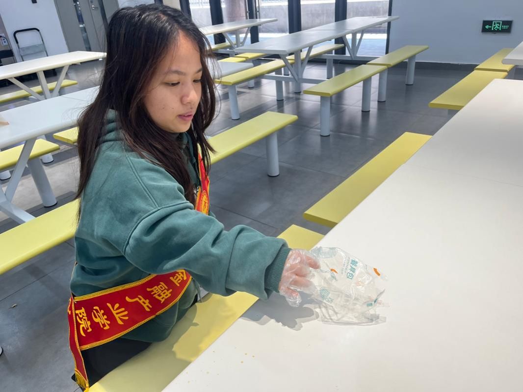 本次活动以校园食堂为核心阵地,志愿者化身文明劝导员,在食堂各区域开展专项督导服务。在就餐区,他们戴上一次性手套,细致清理餐桌上残留的垃圾与食物残骸,将纸屑、餐余等分类丢进对应垃圾桶;同时温馨提醒身边同学,用餐后自觉带走垃圾,保持桌面整洁。在取餐区与通道旁,志愿者们也及时捡拾散落的杂物,用实际行动维护食堂干净有序的环境。