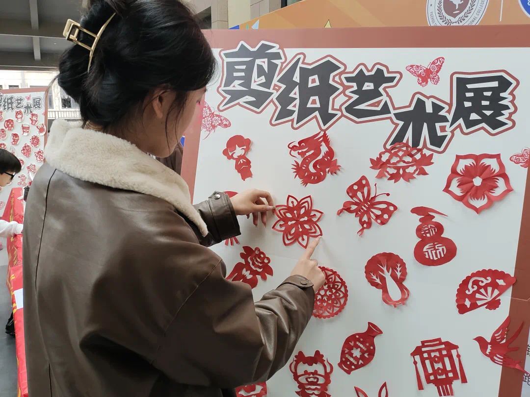精巧别致的剪纸作品错落陈列,红纸翻飞间尽显匠心巧思,刀刻剪裁处皆藏信仰力量。一幅幅承载着青春热忱与红色记忆的佳作整齐悬挂于展览架上,非遗古韵与红色精神交相辉映,成为校园中一道兼具文化底蕴与时代温度的独特风景线。