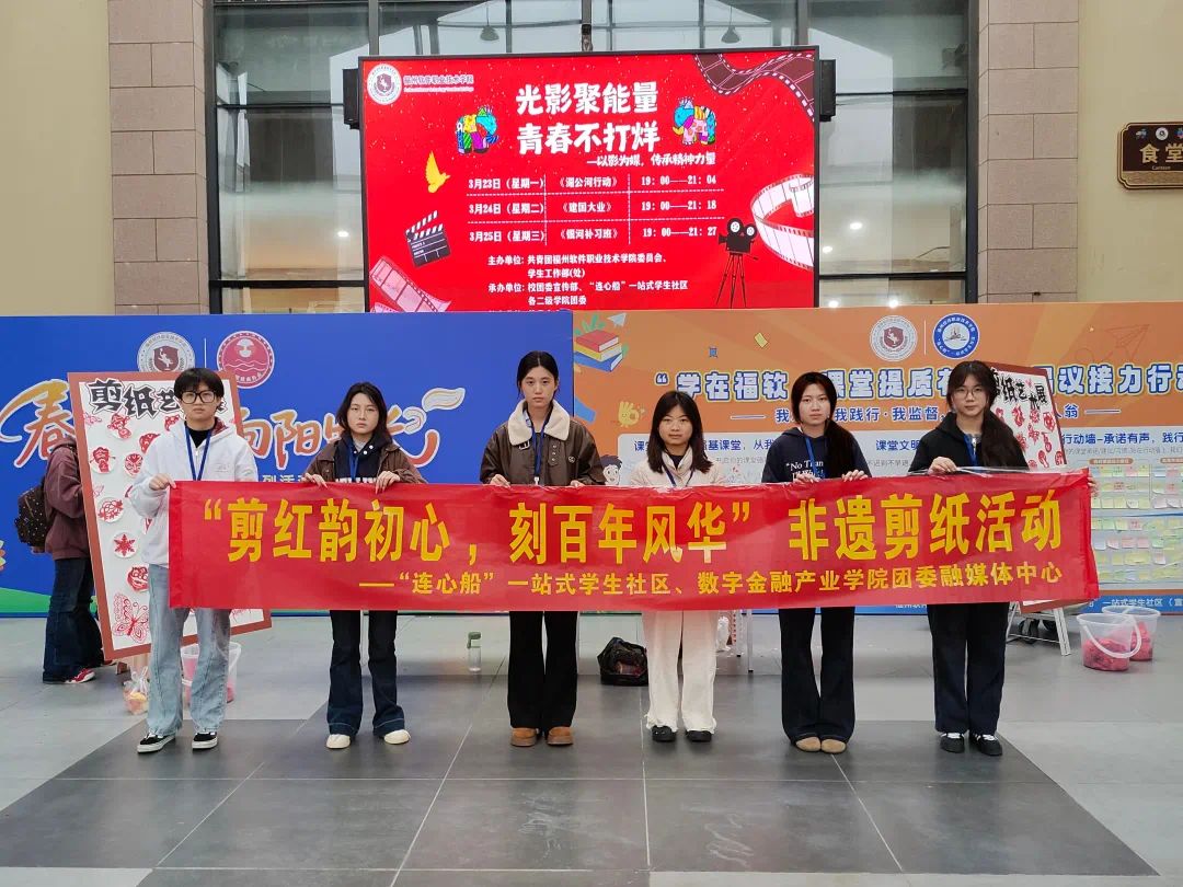 为切实传承中华优秀传统文化,厚植青年爱党爱国情怀,让非遗文化在新时代焕发新生机,向建党105周年献上诚挚祝福。2026年3月24日,福州软件职业技术学院“连心船”一站式学生社区与数字金融产业学院团委融媒体中心在风雨长廊联合开展“剪红韵初心,刻百年风华”非遗剪纸活动。