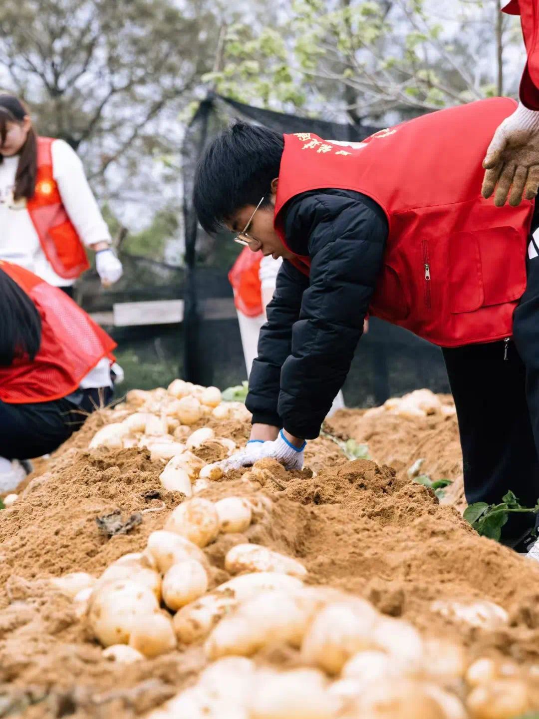 春日田间,泥土芬芳。在三院负责人的带领下,“趣耕”劳动教育联合志愿服务队的志愿者们奔赴田野,开启土豆丰收采摘。大家分工协作、干劲十足,从俯身刨土挖薯,到细心分拣装袋,再到接力搬运装车,每一个环节都有条不紊、毫不懈怠。从种植时的除草松土、施肥灌溉,到收获时的满载而归,志愿者们在亲手劳作中亲历耕耘的不易,在汗水中读懂劳动的价值,用双手收获最踏实的喜悦,让劳动精神在田间地头熠熠生辉。