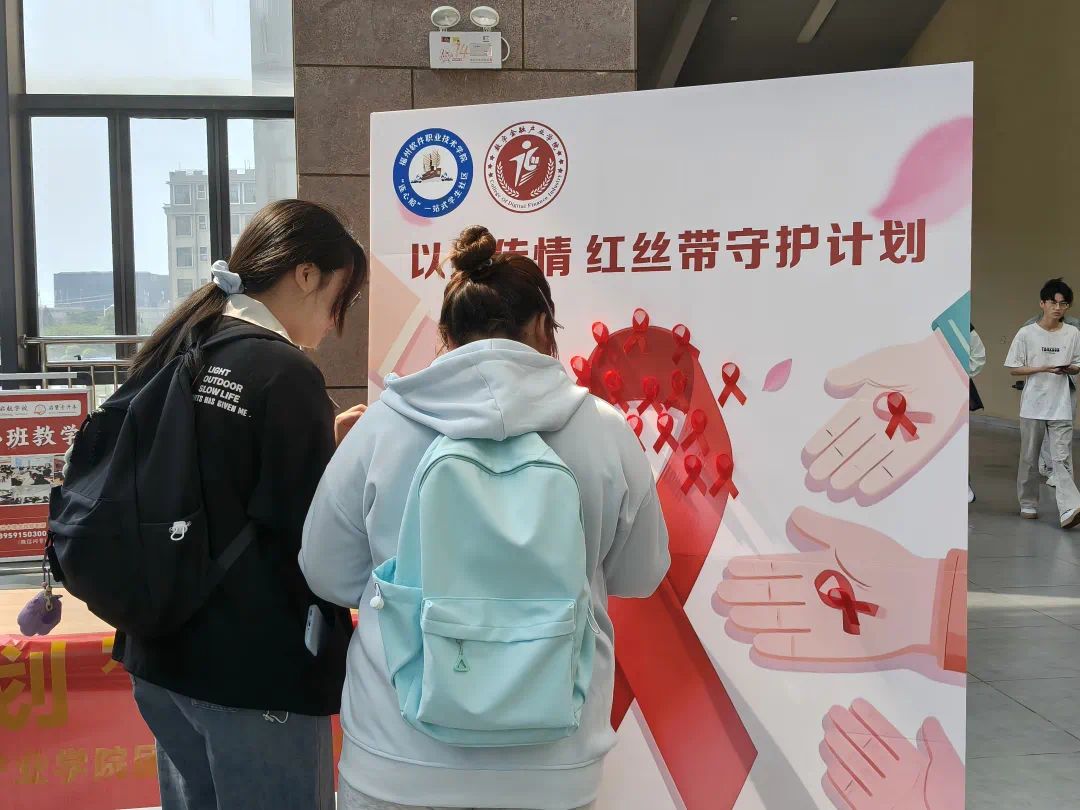 活动现场,工作人员提前布置防艾宣传专区,摆放宣传展板,备好红丝带与防艾知识手册,向同学们普及防艾核心知识,传递科学理性的防艾理念。大家将防艾心愿、暖心祝福与责任承诺寄托在红丝带上,粘贴于防艾展板之上,在温情互动中凝聚防艾共识,以青春力量共筑健康防线,定格校园防艾温暖瞬间。
