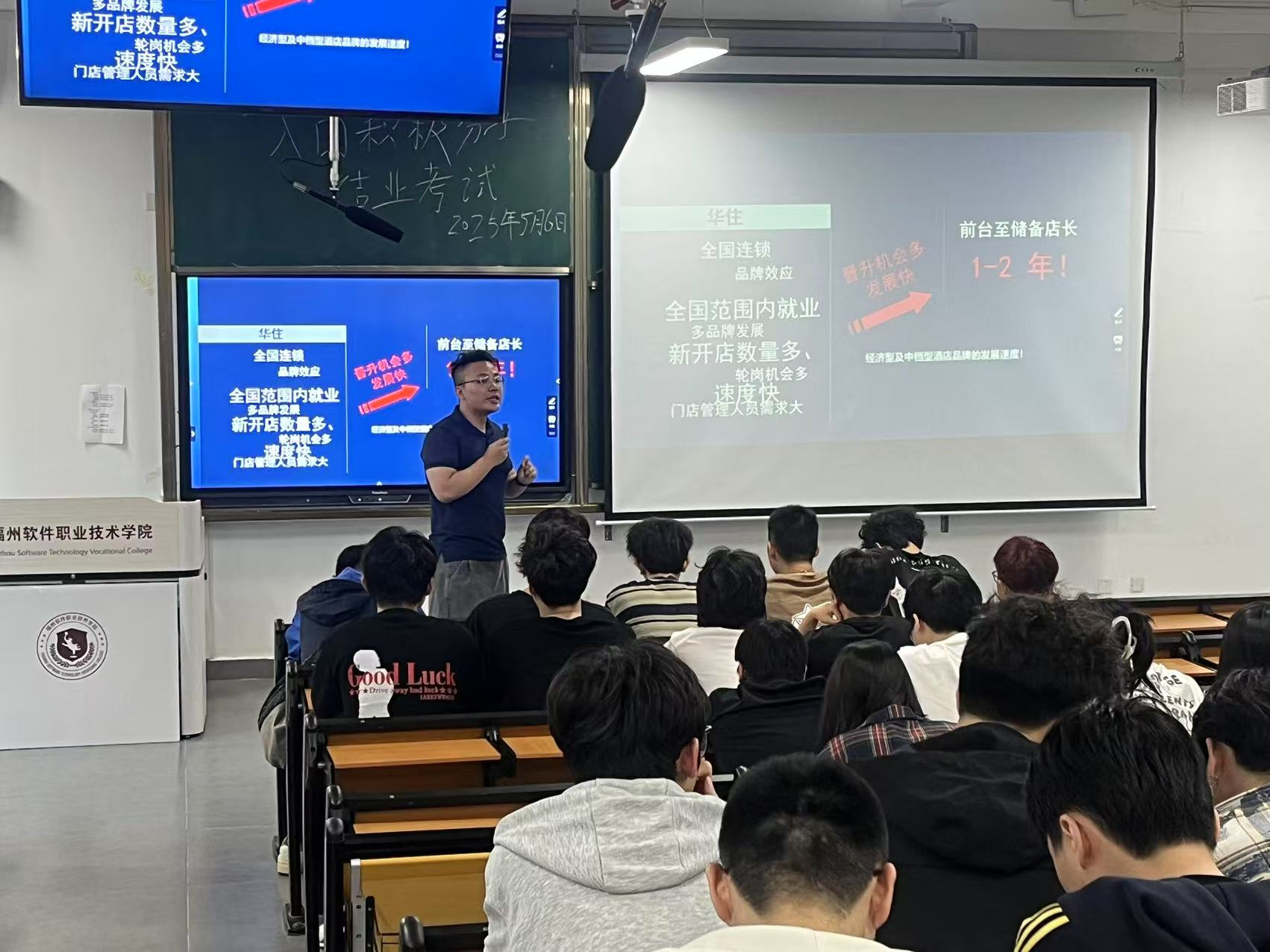 随后,华住酒店管理有限公司李洋帆经理作为主讲人,以生动有趣的方式开启宣讲。李经理首先播放了一段精心制作的企业宣传片,片中展示了华住酒店遍布全球的业务版图、高端大气的酒店环境以及员工积极向上的工作风貌,瞬间点燃了现场氛围。这不仅让同学们直观感受到华住的实力,更激发了大家对酒店行业技能应用的无限遐想,与职业教育周倡导的技能创造美好生活理念相呼应。
