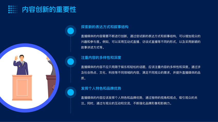 接着,黄总还指出除了新技术的运用,直播媒体的未来发展还需要注重内容创新和社交互动。在内容方面,我们需要不断探索新的表达方式和叙事结构,让直播内容更加有趣、生动、有深度。同时,我们还需要关注观众的需求和反馈,不断优化直播内容。在社交方面,我们需要搭建更加开放、互动的平台,让观众能够更加便捷地参与直播互动,增强观众的参与感和黏性。