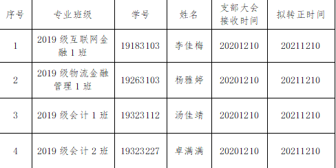 经支部委员会讨论,以下同志(具体名单附后)预备期满一年,并已向党组织递交转正申请书,本支部拟定于近期召开支部大会讨论以下同志的转正问题。根据《关于在发展党员工作中实行公示制的规定》要求,现将拟转正预备党员名单予以公示。凡对以下同志的转正问题有异议者,请在公示期内以口头或书面的形式向本支部或学院党委反映。