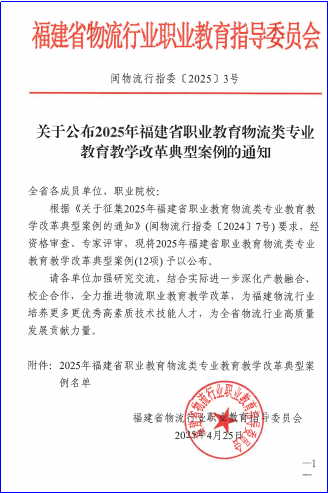 近日,福建省物流行业职业教育指导委员会正式公布2025年福建省职业教育物流类专业教育教学改革典型案例名单,由钱叶霞老师领衔、彭静老师与林佳欣老师共同参与申报的《“双元育人”现代学徒制人才培养模式的创新实践》《深化产教融合,共育物流人才》两项案例成功入选省级典型案例,充分彰显了学校在物流职业教育教学改革领域的扎实成果与创新实力。