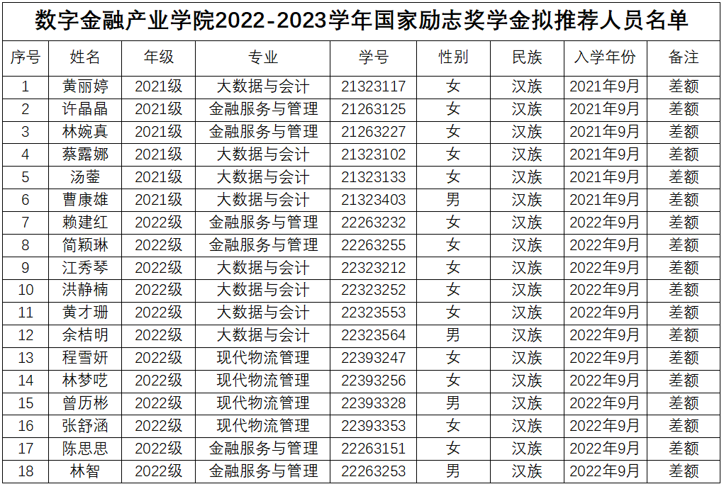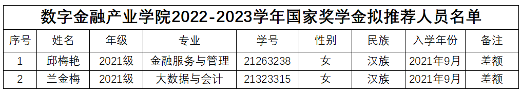 根据《福州软件职业技术学院国家奖学金评审办法》、《福州软件职业技术学院国家励志奖学金评审办法》等相关文件精神,经学生申报、辅导员审核、学院奖学金评审委员会评审等环节,现将2022-2023学年数字金融产业学院国家奖学金、国家励志奖学金拟推荐名单公示如下,公示期为3天(2023年10月9日-2023年10月11日)。在此期间欢迎广大师生以来信来访的形式向数字金融产业学院反映情况,发表看法和意见,来信邮箱:1846580206@qq.com。