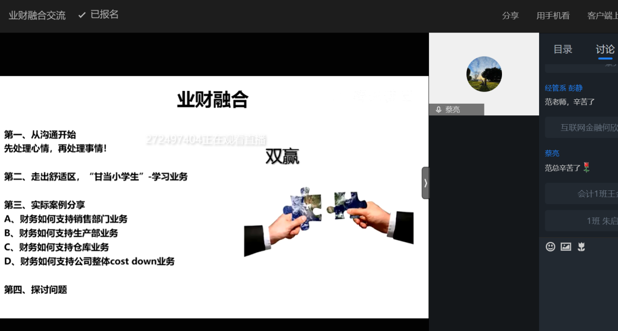 2022年5月14日晚上,益童乐贸易(福州)有限公司福建公司负责人范鹏,12年知名外资企业财务管理经验,4年知名美国户外游乐玩具工厂负责人,在腾讯课堂为我院19级会计专业1-2班,20级会计专业1-4班,21级大数据与会计1-4班以及其他感兴趣的在校同学带来了主题为《“业财融合实战——财务如何支持业务”》的精彩讲座。学院经济管理系主任彭静老师、副主任蔡亮老师,财经教研室主任吴淑芳老师,以及会计专业骨干教师谢惠芳、高银娜等参加了会议,会议由蔡亮老师主持。