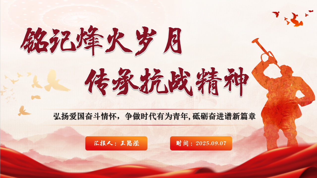 接着,党课围绕“民族丰碑”“精神火炬”“青春担当”三个方面展开。“民族丰碑”部分重点指出,抗日战争胜利是中华民族从危机走向复兴的关键转折点,既终结近代外来侵略屈辱史,更推动民族觉醒与团结;“青春担当”部分强调当代青年需从深化历史认知、强化实践体验、融入报国行动发力,将抗战精神转化为行动,投身国家发展领域。“精神火炬”部分,聚焦抗战精神当代传承的多方面路径。