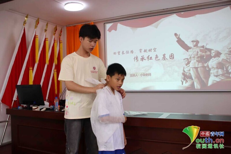 图为实践队员示范三角巾包扎。李小阅 供图