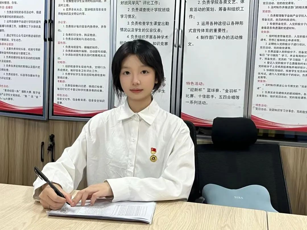 许晓妍,共青团员,现任数字金融产业学院团委融媒体中心主任、2023级网络营销与直播电商3班班长。在思想上,该同学紧跟时代步伐,认真学习党的方针政策,积极参与青马工程培训班等思想教育活动,主动向党组织靠拢,以先进思想武装头脑。在学习上,该同学始终保持专业前列,注重知识拓展,多次在学科竞赛中获奖,用扎实的学习成果展现进取精神。在工作上,该同学兼顾班级管理与团委事务,合理分配时间,高效组织活动,推动班级建设与学院工作有序开展。在生活中,该同学为人热情、乐观向上,主动关心同学,积极参与公益活动,用实际行动传递青春正能量。