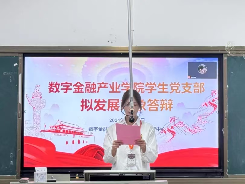 为进一步加强学生党支部建设,严把党员发展质量关,为党注入新鲜血脉,保持党的生机和活力。数字金融产业学院学生党支部于2024年11月17日19:00在教学楼A607召开2024年下半年拟发展对象答辩会,参加此次答辩会的有数字金融产业学院党总支书记周政超、党总支副书记张建培、团委书记林恬、学生党支部书记吴艳文及12位拟发展对象。