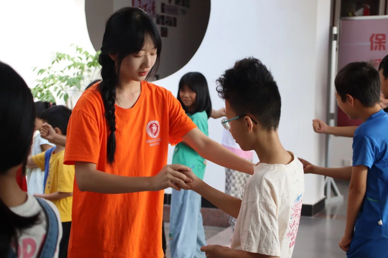 实践队队员首先向小朋友们讲解示范咏春拳基础手法和实用的防身招式。随后,“摊手佛手,一、二、三、四……”强劲有力的口令声响彻课堂,在队员们的指引下,小朋友们化身“咏春小能手”,跟着节奏,整齐划一地打出咏春招式,一步一拳,将咏春拳的防守紧密、刚柔并济等特点展现得淋漓尽致,尽显咏春文化的经典与魅力。