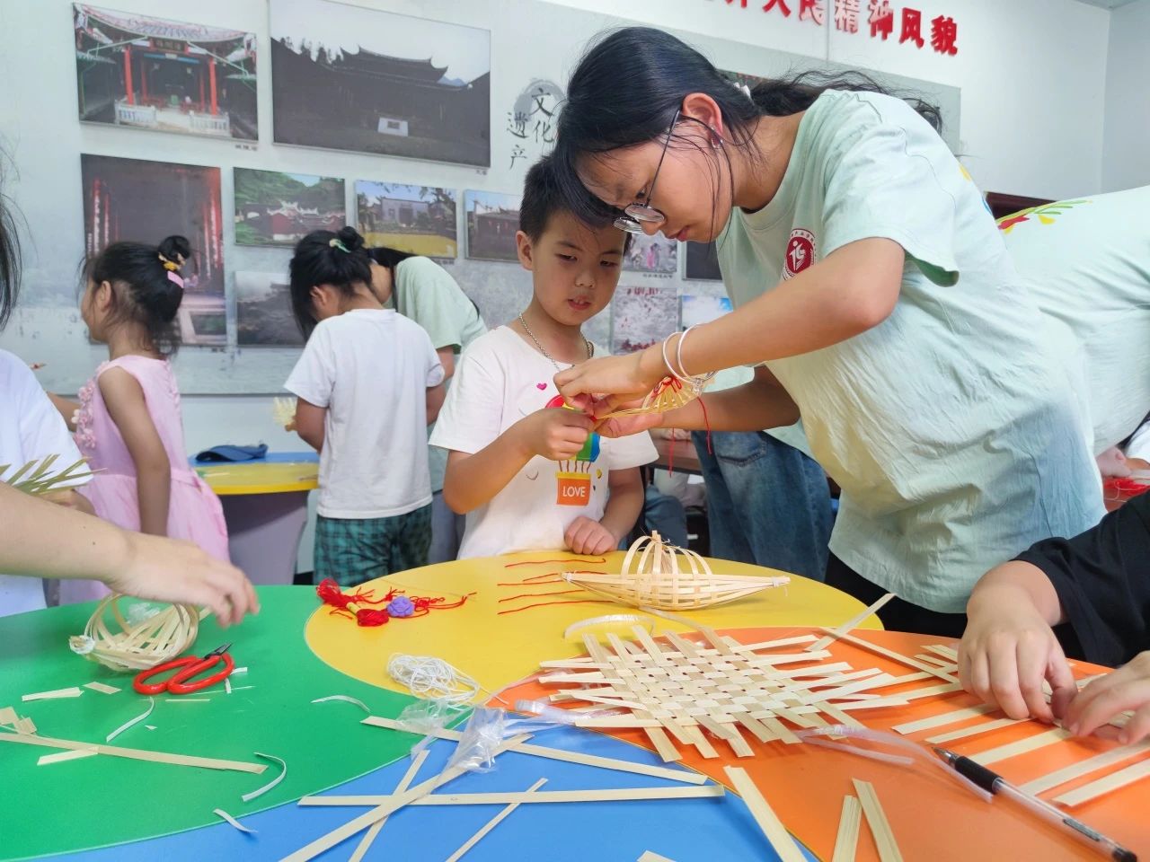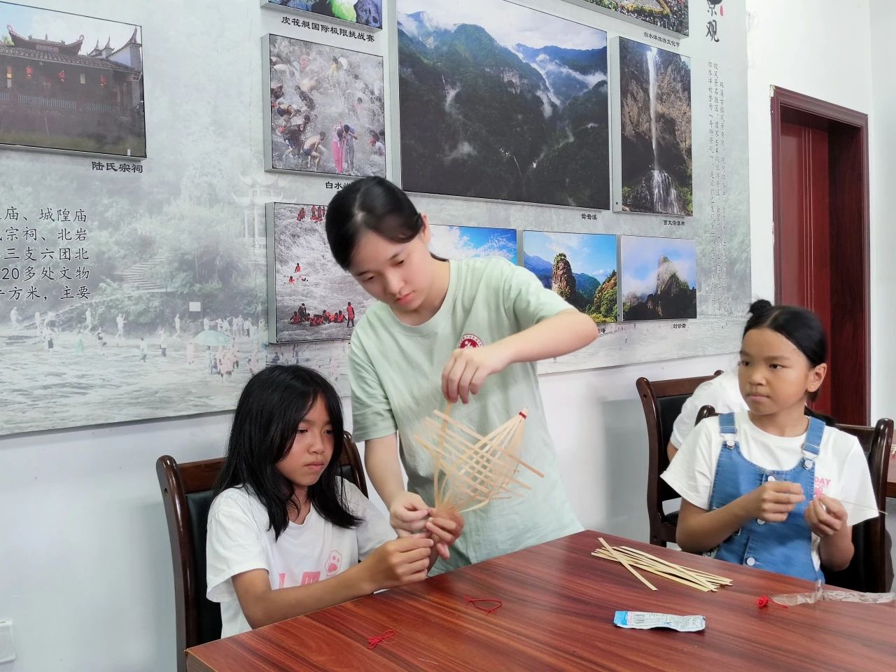 孩子们化身能工巧匠,在实践队员的带领下一编一织、一挑一压,组合穿插零散的竹条,体验竹编工艺的挑二压二技法,将自然之美浓缩在纵横之间,无不彰显出传统手工艺的魅力,匠心思维的传承,更是传统竹编艺术的魅力绽放。