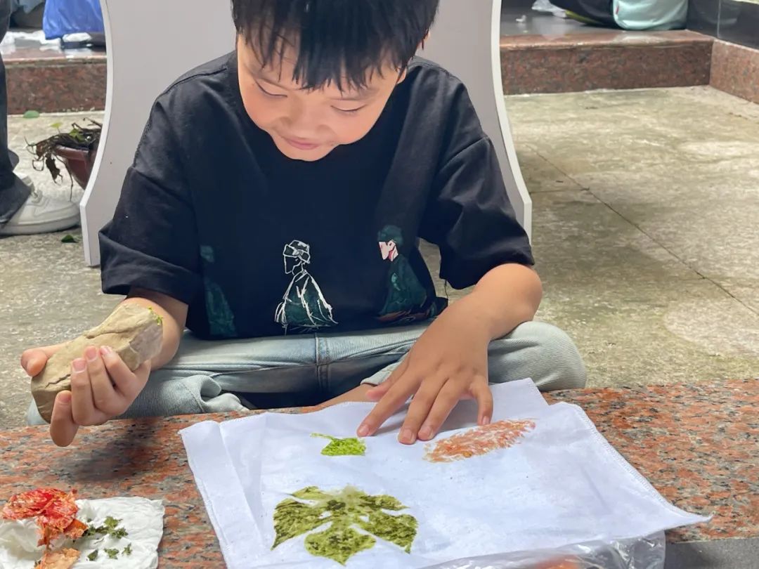 7月18日,志愿者向小朋友们介绍了植物拓染的演进历程和制作原理及具体方法。随后,小朋友们亲自动手体验植物拓染过程,小朋友们自由挑选喜欢的树叶和花朵,在棉布上排列设计并均匀敲击,最终加上彩色流苏点缀,当一幅幅拓染作品踊跃而出,小朋友们欣喜不已。这次活动让小朋友们感受到植物的魅力,增加了对传统手工织染文化的了解与认知,更加深切地感受到中华民族博大精深的历史文化。