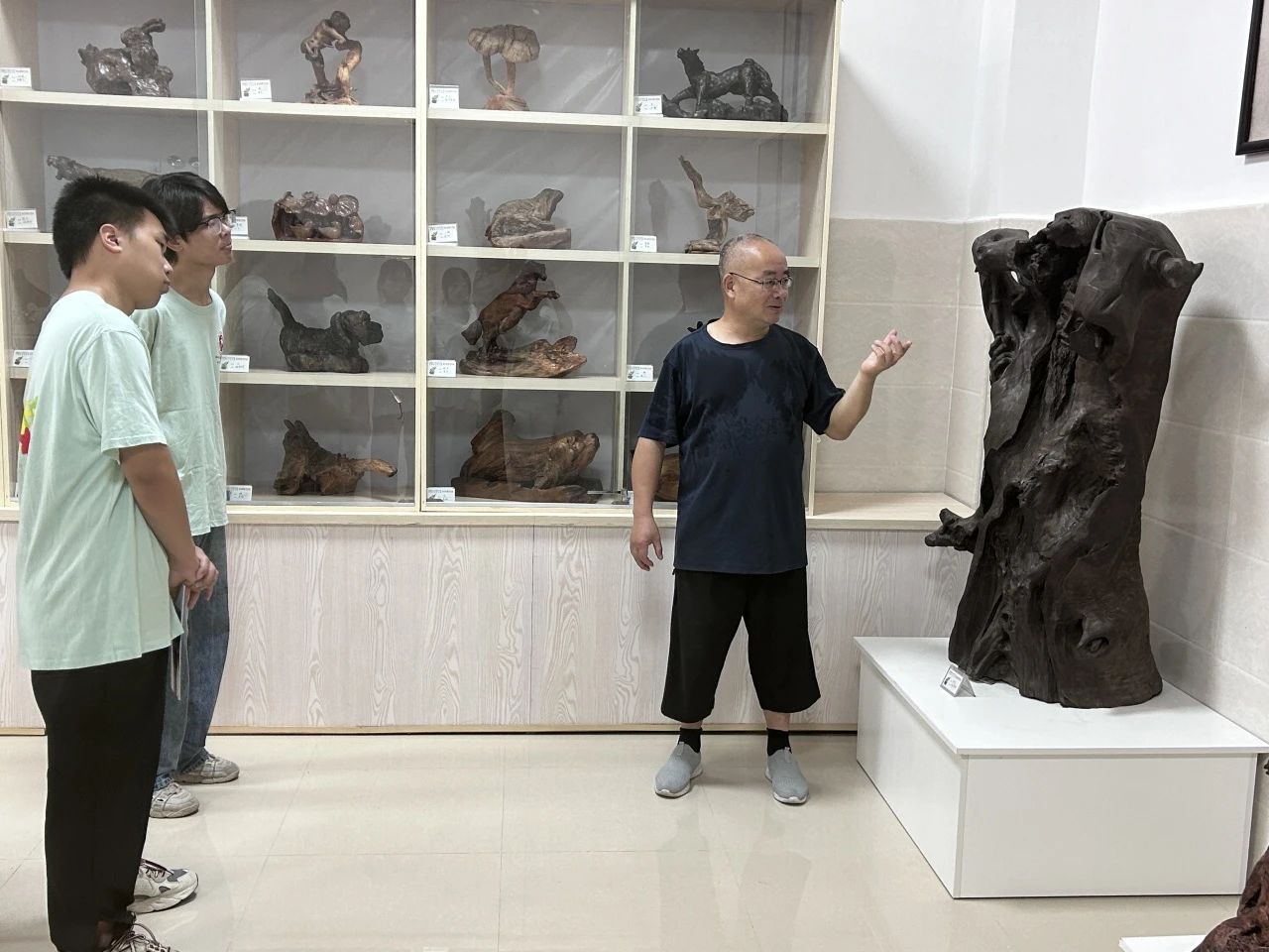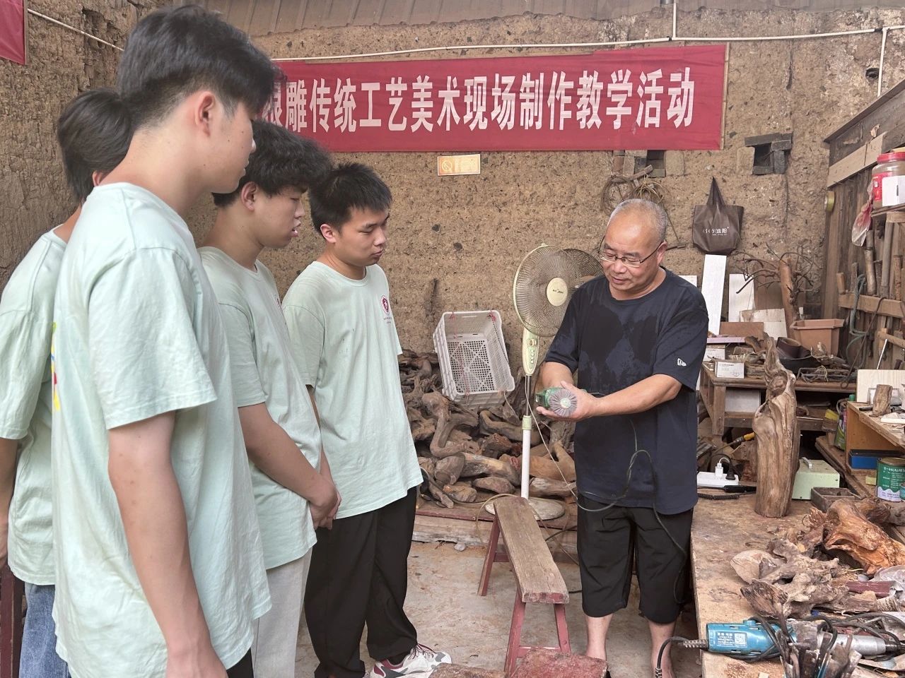 “选材、清土、去皮、设计、雕刻、打磨……”我们随张老师前往了根艺工作室,在他的带领下我们体验了树根到根艺作品背后所涵盖的故事,切身体会到了根艺之所以成为宝,贵在天然,难在创新。在实践学习的过程中张老师就如何弘扬传承根艺文化、如何使非物质文化遗产绽放出更加迷人的光彩赋能乡村振兴和师生共同探讨。让实践队员进一步增强文化自觉,坚定文化自信,用青春力量赋能乡村振兴。