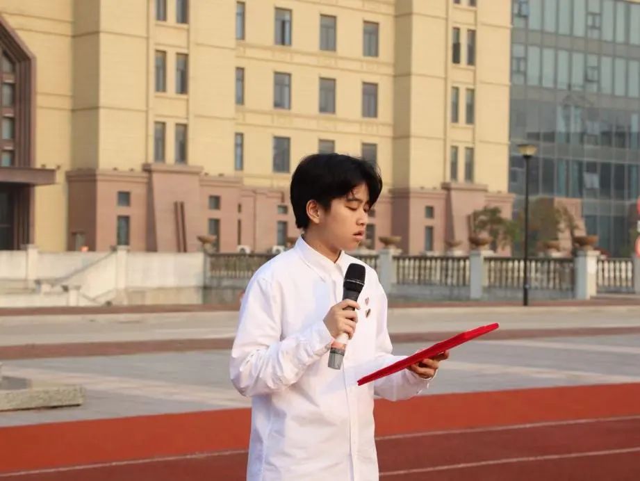 清晨七时,同学们整齐列队,升旗仪式正式开始。铿锵步伐响彻晨曦的寂静,金灿的日光照耀着国旗。国旗护卫队的同学步履铿锵,目光坚定,肩扛国旗,迈着庄严的步伐,护送五星红旗至国旗台。