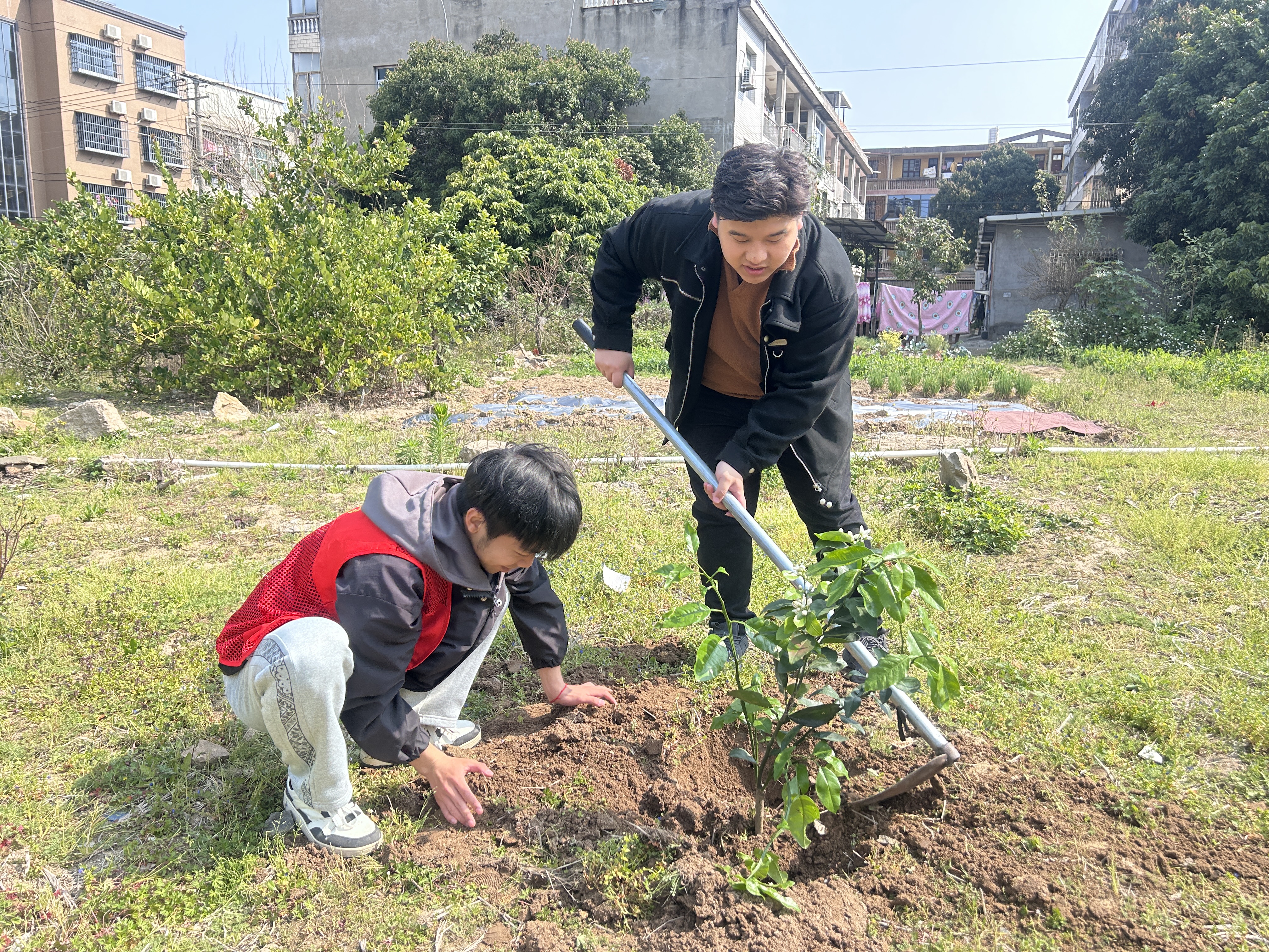 春风十里,不及一抹绿意。植树现场,志愿者们激情高昂,分工明确、干劲十足,挥锹铲土、培土围堰、提水浇灌、扶树正苗…每个环节都井然有序、配合默契。经过志愿者与老师们共同配合,树苗苗基实稳固、盎然挺拔,放眼望去,一片绿意盎然。