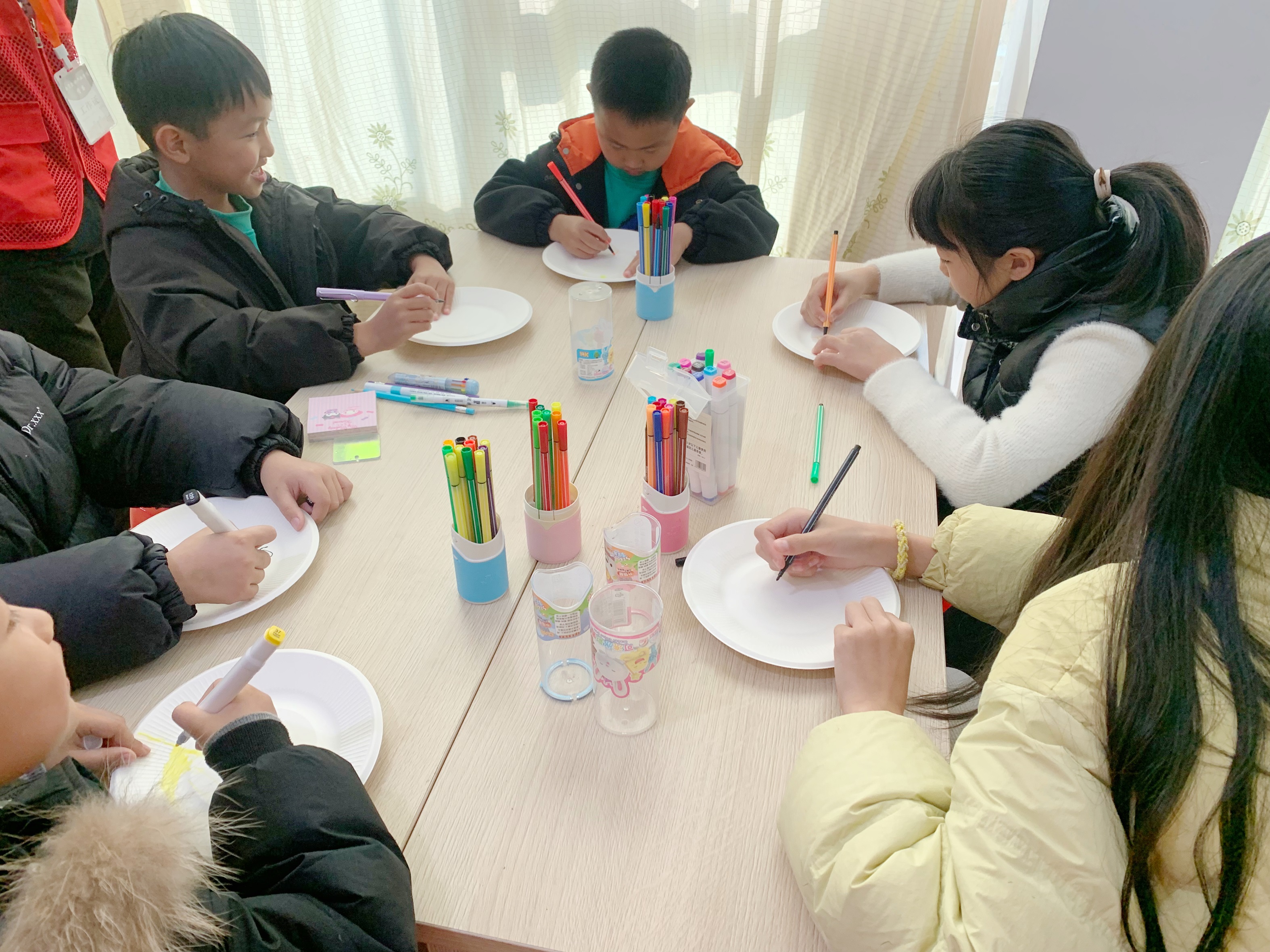 志愿者为小朋友介绍色彩搭配的要领,引导他们用水彩笔在餐盘上充分发挥自己的想象力进行创作,经过大家的共同努力,制作出一幅幅绘声绘色,惟妙惟肖的作品,感受色彩带来的艺术魅力。