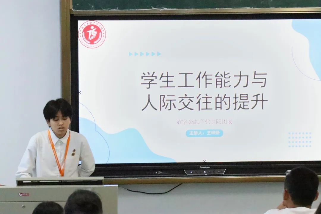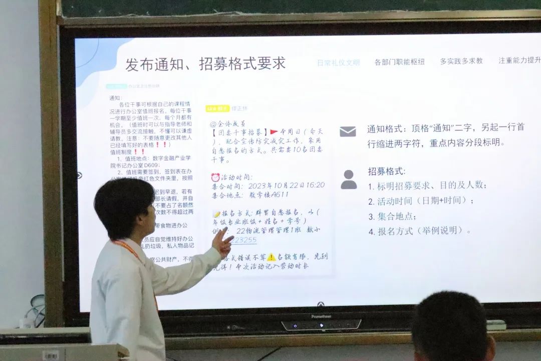 为进一步提高新生骨干思想政治素养和工作能力,使其在思想意识上明确自身职责,认真为同学们服务,近日,数字金融产业学院团委在教学楼A305、A306开展干事培训第二讲,本次培训涵盖日常礼仪文明、各部门职能工作、以练促学等技巧。培训会由学生党务管理中心吴筱晗同学主持,团委学生会执行主席王梓妍同学主讲。