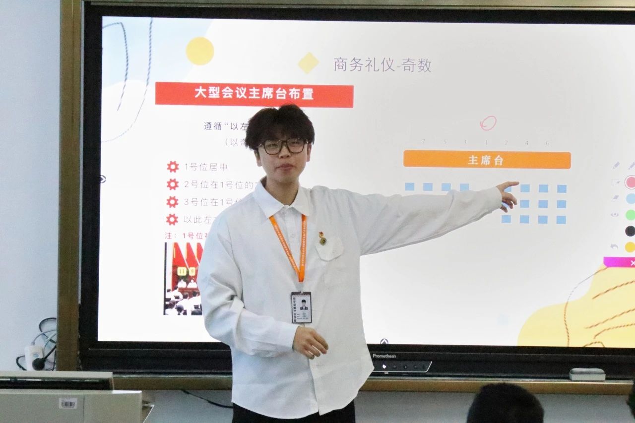 在商务礼仪讲解上,缪正林同学介绍了会议主席台的布置、回字型会议布置、会场设置、礼貌用语等注意事项。使同学们对商务礼仪有更深层次的了解,互动式的交流使各团学干部更加铭记在心,为今后各项团学会议有效开展奠定良好基础。