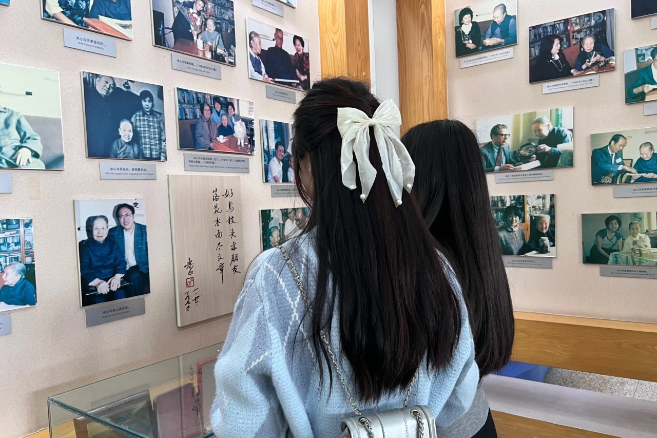 活动伊始,同学们跟随着团员宣讲队的步伐,在他们的带领和讲解下,同学们参观了“冰心生平与创作展览”,深刻感悟了她对于爱和美的追求——把“有了爱就有了一切”作为一生的信念。冰心生平介绍及文学作品中,无一不透露着那流淌在文字里的,海纳百川的胸襟以及赤诚的爱国爱民之心。同学们近距离观摩和体会冰心先生的文学人生及大爱精神,犹如与伟大作家的灵魂之旅。
