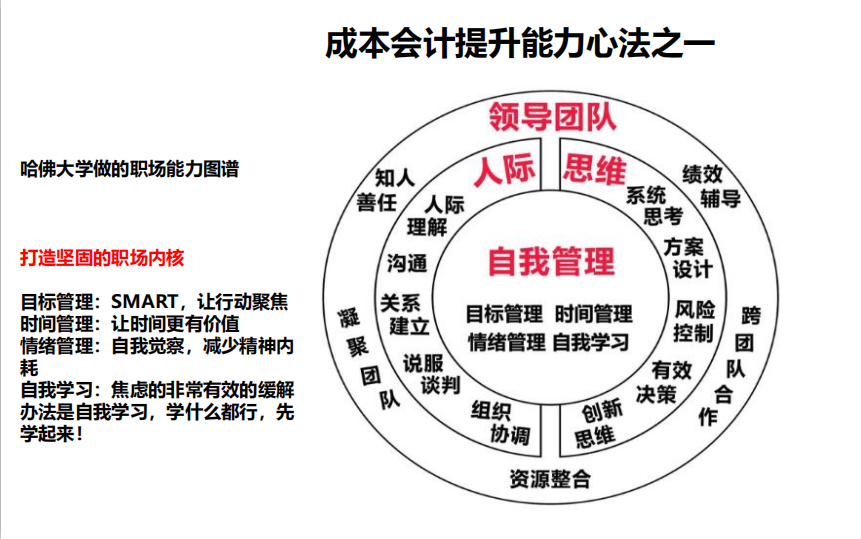 接着范总给大家分享成本会计提升能力心法之一,即 打造坚固的职场内核。体现在以下4个方面:1.目标管理:SMART,让行动聚焦;2.时间管理:让时间更有价值;3.情绪管理:自我觉察,减少精神内耗;4.自我学习:焦虑的非常有效的缓解办法是自我学习,学什么都行,先学起来!成本会计提升能力心法之二是需要有主动担责的态度和意识。金句: 我还能做点什么?做什么都可以,先做起来!成本会计提升能力心法之三是改变思维方式。范总还给学生们推荐了一本书《高效能人士的七个习惯》。这本书让世人明白一个真理:如果我们觉得自己穷,就会真的穷。柯维博士教给我们:改变生活的关键是改变思维方式——我们每个人都有无穷的潜力,前途无限。