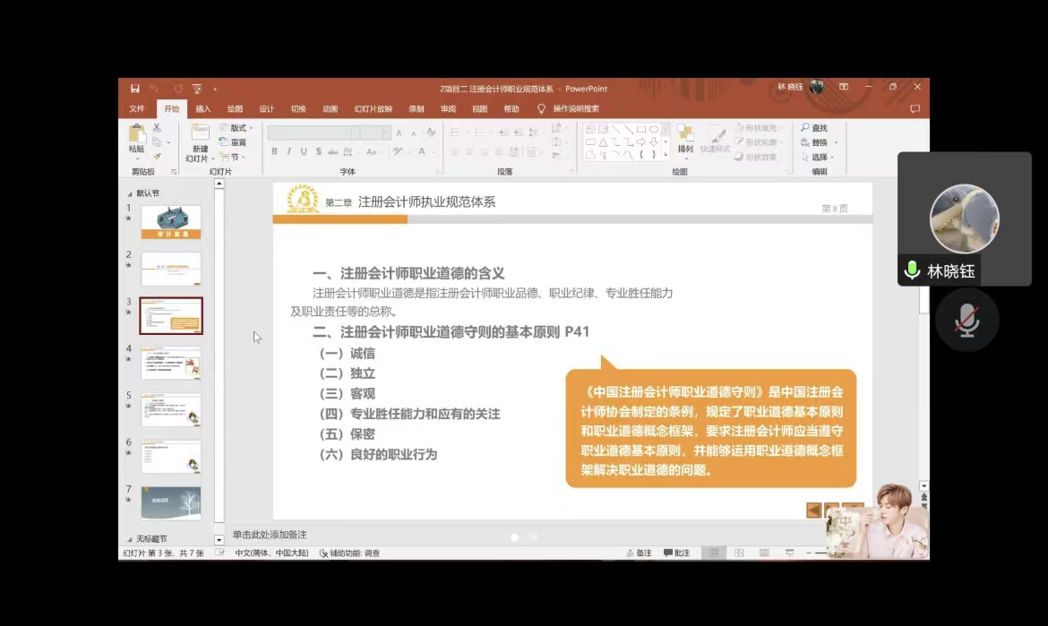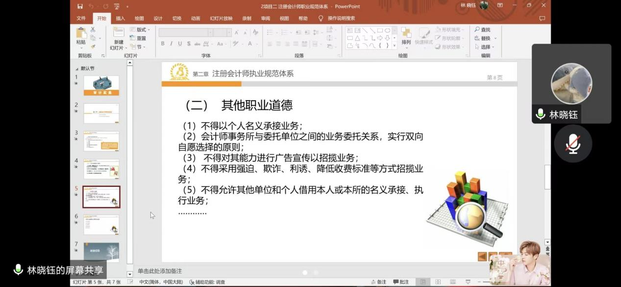 为了引导同学们深入了解审计的职业道德,并与实际工作相联系,强化“以德立身”理念。在2023年3月02日上午2021级大数据与会计4班《审计实务》的课堂上,江丹清老师邀请20级会计专业的优秀校友林晓钰通过腾讯会议在线讲解审计职业道德的内容以及重要性。