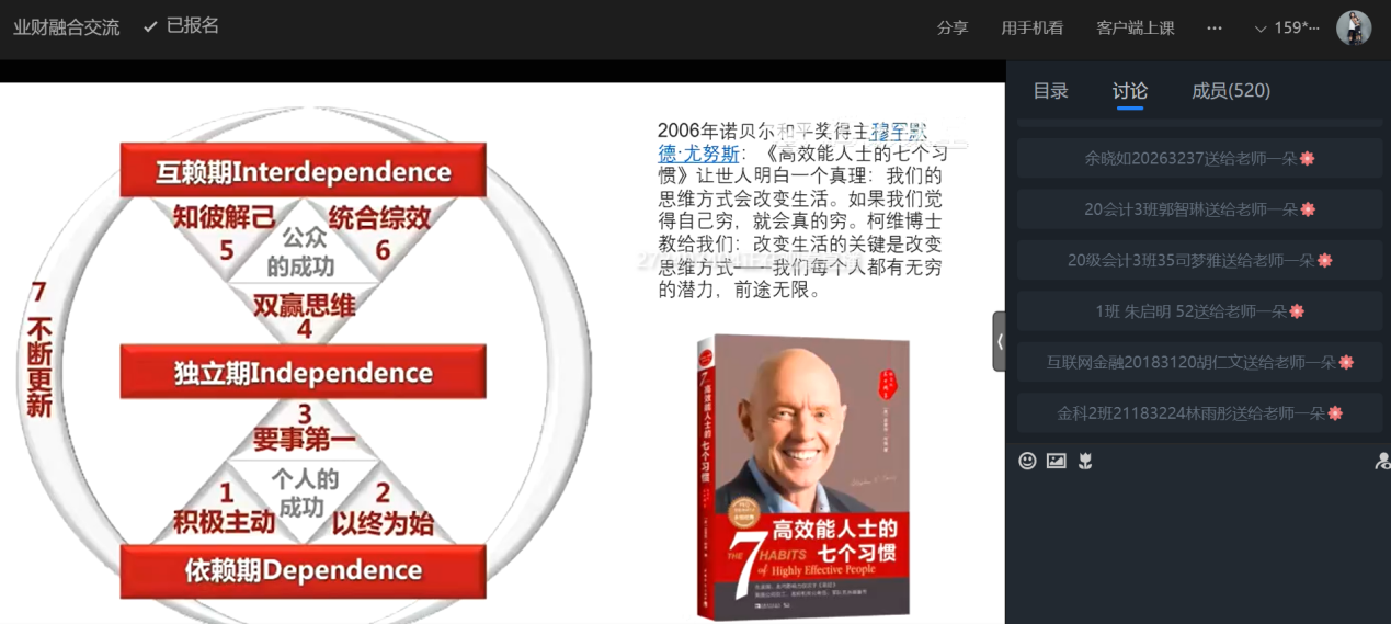 企业有必要对业务人员和财务人员进行旨在提高沟通能力的培训。同时,范总还给学生们推荐了一本书《高效能人士的七个习惯》。积极主动、以终为始、要事第一、双赢思维、知彼解己、统合综效、不断更新